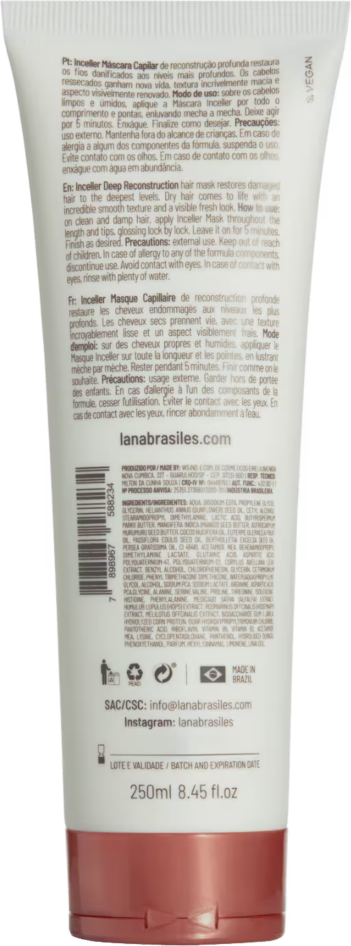 Máscara para cabelos danificados e ressecados. Lana Brasiles Inceller oferece tratamento de reconstrução profunda.