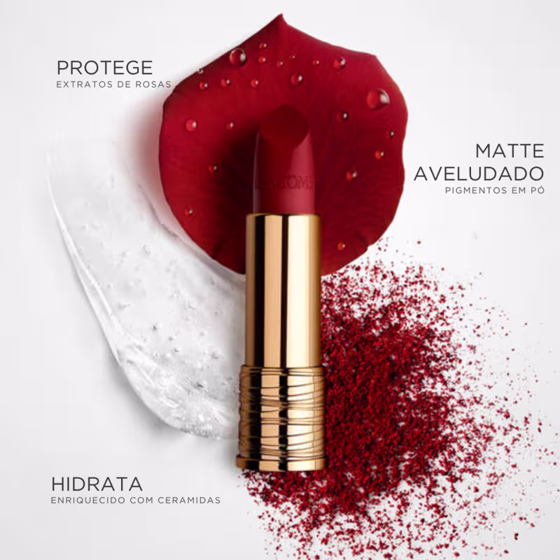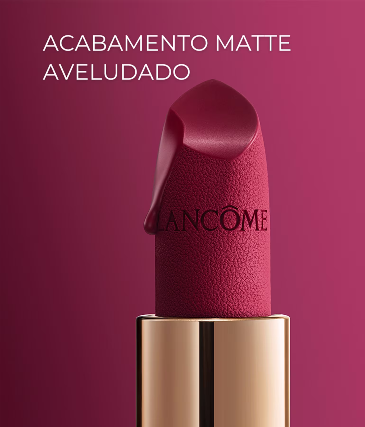 - ▸ O Lancôme L'Absolu Rouge Drama Matte entrega um acabamento matte aveludado e impecável.