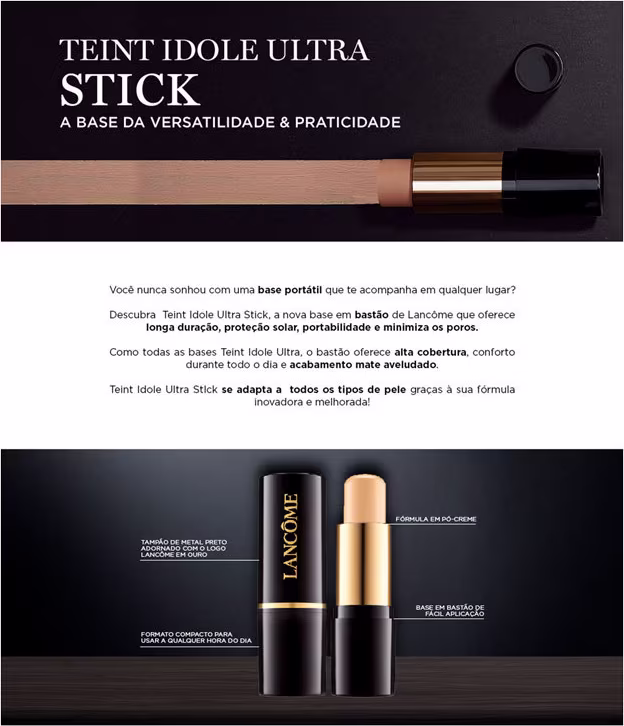 Base em Bastão Lancôme Teint Idole Ultra, com cobertura multiuso de acabamento fosco. Melhores Bases Lancôme na BLZ Ver mais ❯