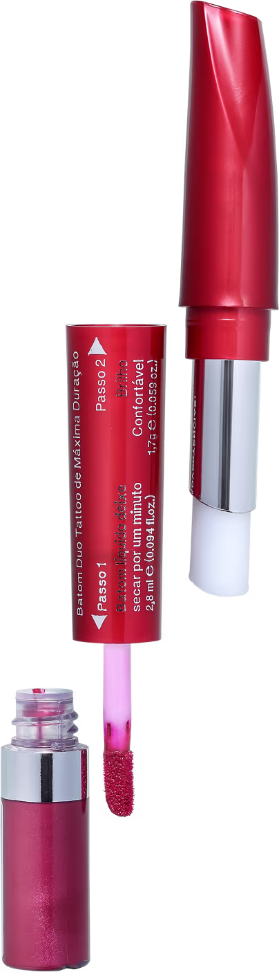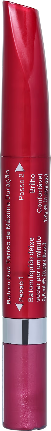 Batom Líquido Color Maxtime Duo Tatto L'Bel possui fórmula com pigmentos puros para alta carga de cor e duração. É ideal para quem deseja uma boca impecável por horas e sem a necessidade de retoques. Além do batom, você também ganha um brilho hidratante fixador em um único produto, para potencializar o efeito.
