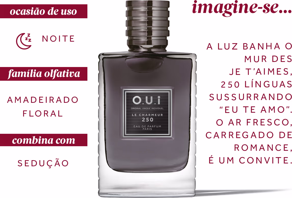 Le Charmeur 250 Eau de Parfum, de O.U.i, convida você a vivenciar a sedução reinventada, ressignificando a arte da conquista com uma fragrância tão única quanto marcante. Para o homem que é autoconfiante, expert e exigente, este eau de parfum é um passaporte para o savoir vivre e o savoir faire francês.