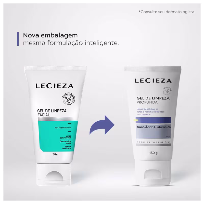 O Gel de Limpeza Facial Lecieza é recomendado para todos os tipos de pele e promove uma limpeza profunda com agentes hidratantes que agem de forma eficaz, respeitando o equilíbrio natural da pele.