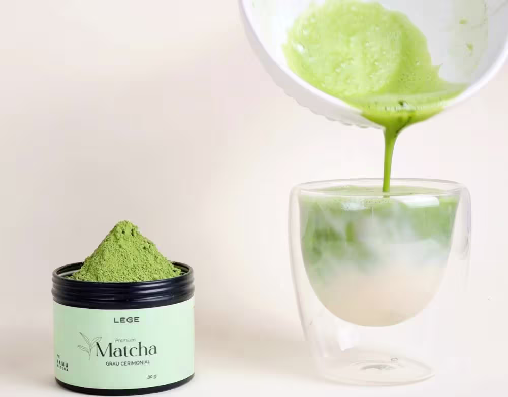 Chá verde em pó. Lége Matcha Premium Grau Cerimonial é feito a partir das folhas jovens da planta, ele é rico em antioxidantes, L-teanina e cafeína.