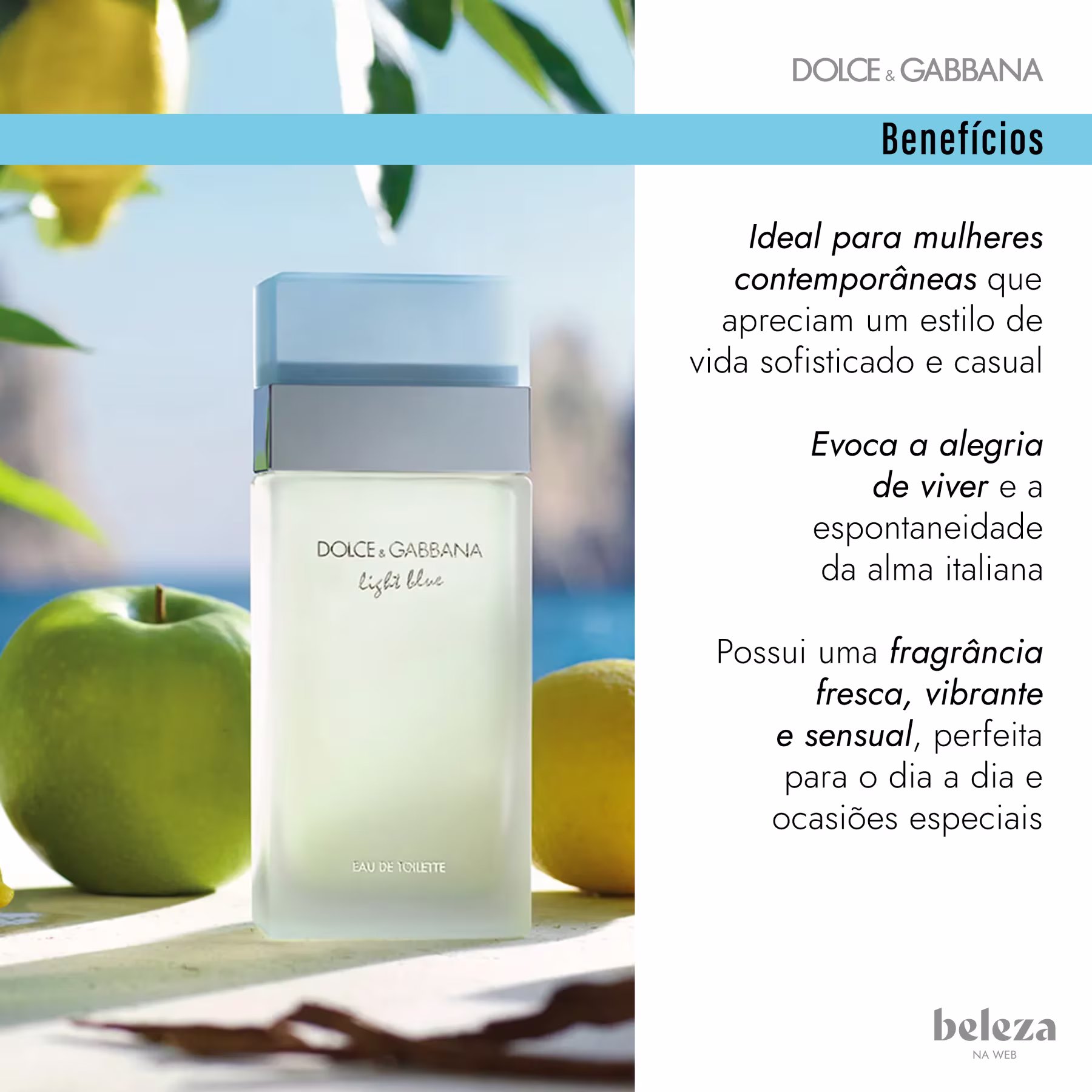 Light Blue é um perfume importado Dolce & Gabbana feminino floral frutado. Ideal para mulheres contemporâneas que apreciam um estilo de vida sofisticado e casual. O Light Blue traduz a energia radiante do sol e o brilho das noites mediterrâneas, revelando uma sensualidade irresistível.