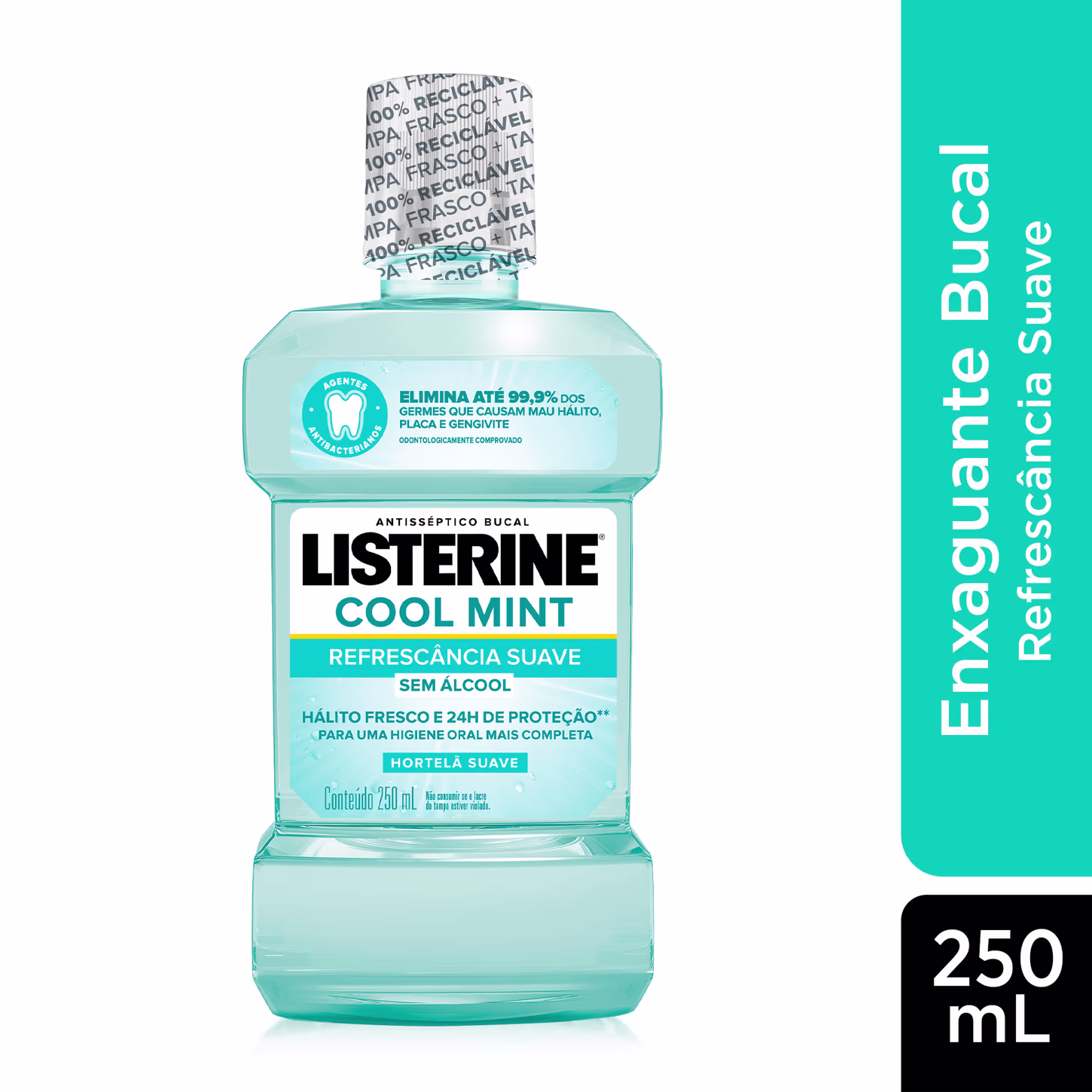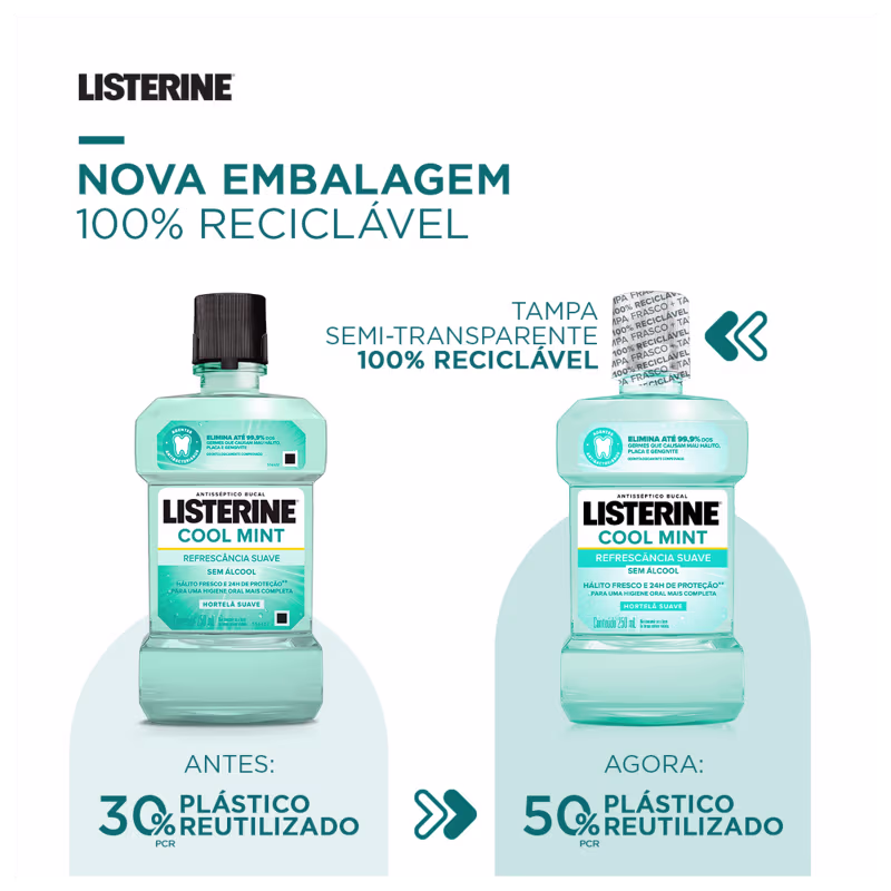 O Antisséptico Bucal Listerine Cool Mint Refrescância Suave promove mais proteção contra mau hálito, placa e gengivite, com fórmula exclusiva com agentes antibacterianos. Sabor de menta com refrescância suave, sem álcool, oferece 24 horas de proteção com o uso a cada 12 horas. Além disso, é um produto 100% reciclável (frasco e tampa) e feito com 30% de plástico reciclado.