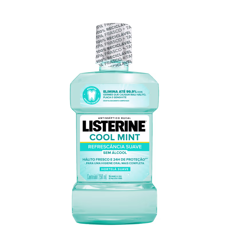 Não sei o CEPAntisséptico bucal. Listerine Cool Mint Refrescância Suave limpa aonde a escova não alcança, eliminando até 99% dos germes que causam placa, gengivite e mau hálito, com até 24h de proteção.