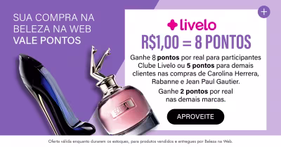 Ganhe 8 pontos por real gasto em produtos Carolina Herrera, Rabanne e Jean Paul Gautier exclusivo para assinantes Clube Livelo; 5 pontos por real para demais clientes nos produtos Carolina Herrera, Rabanne e Jean Paul Gautier e 2 pontos por real nos demais itens, válido para vendidos e entregues por Beleza na Web. Campanha válida de 23 a 26/03/2026. Consulte o regulamento.