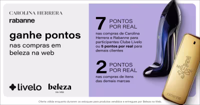 Ganhe 7 pontos por real gasto em produtos Carolina Herrera e Rabanne exclusivo para assinantes Clube Livelo; 5 pontos por real para demais clientes nas marcas selecionadas e 2 pontos por real nos demais produtos, válido para vendidos e entregues por Beleza na Web. Campanha válida de 06 a 08/03/2026. Consulte o regulamento.