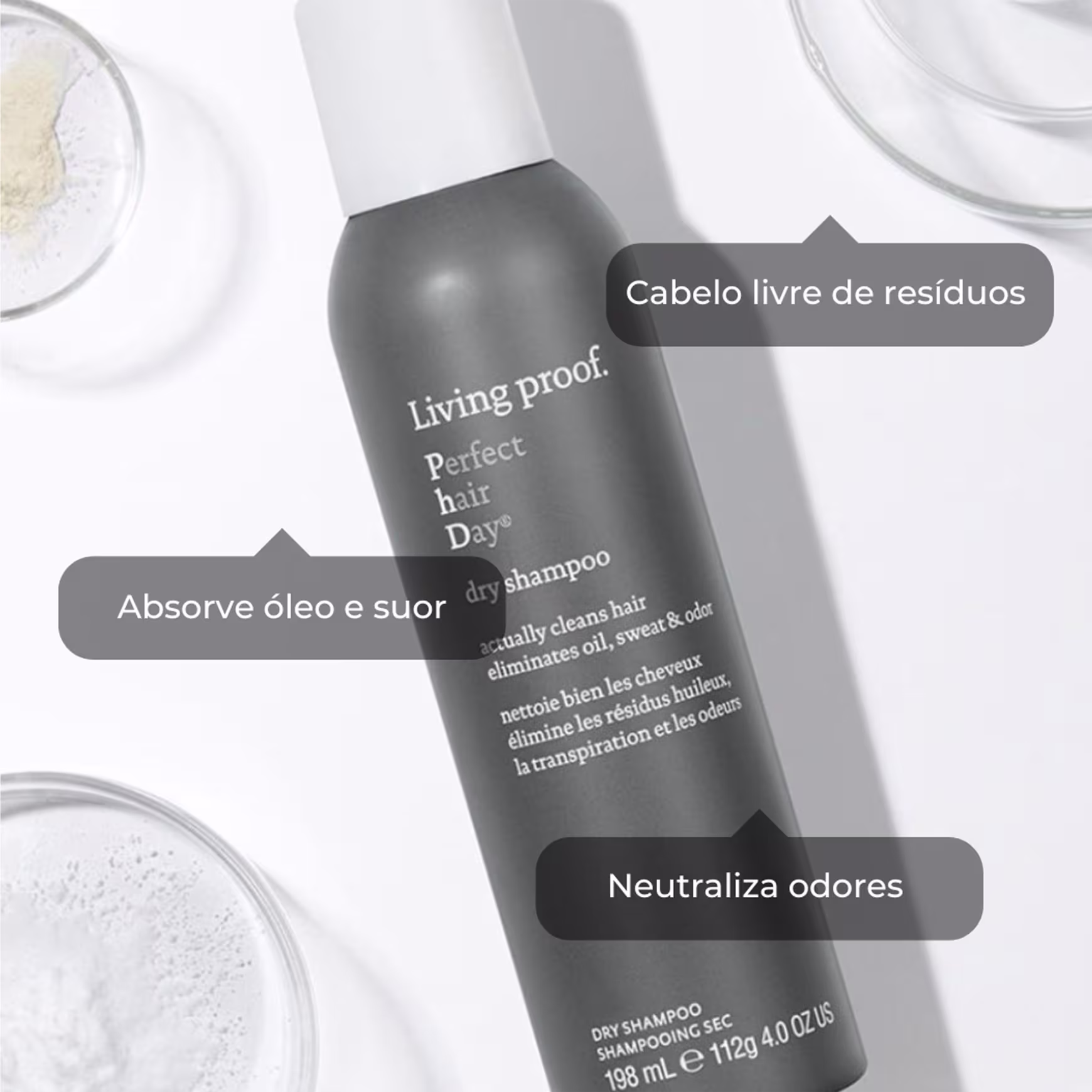 O Shampoo a Seco Living Proof Perfect hair Day (PhD) conta com ativos de efeito rápido que retiram a oleosidade dos cabelos, suor e odor e também permitem uma fácil remoção, para que os cabelos fiquem cheirosos e mais limpos.