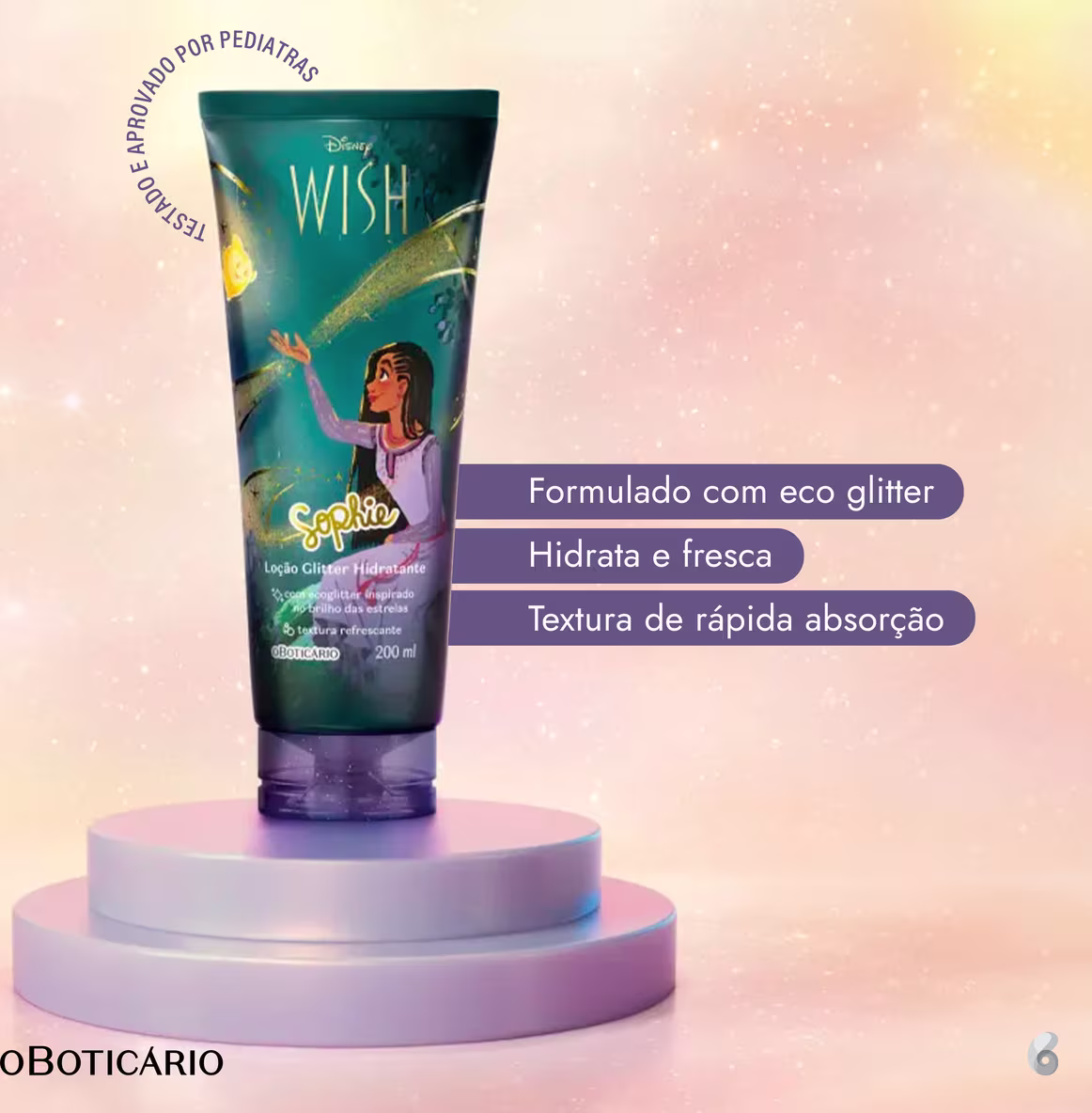 A Loção Glitter Hidratante Corporal Sophie Disney Wish deixa a pele macia e perfumada com o cheirinho inspirado no brilho das estrelas e textura aquagel refrescante, repleta de ecoglitter dourado, como se fosse a poeira estelar da personagem Estrela!