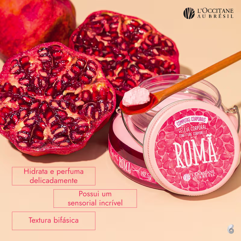 A Geleia Hidratante Desodorante Corporal Romã L’Occitane au Brésil Romã possui textura bifásica, que ao entrar em contato com a pele brinca com o sensorial. Além disso, é muito hidratante e perfumada. Inspirada nos doces de frutas brasileiros, a Linha Romã é um verdadeiro passeio por diferentes sensações, celebrando a diversidade do país!