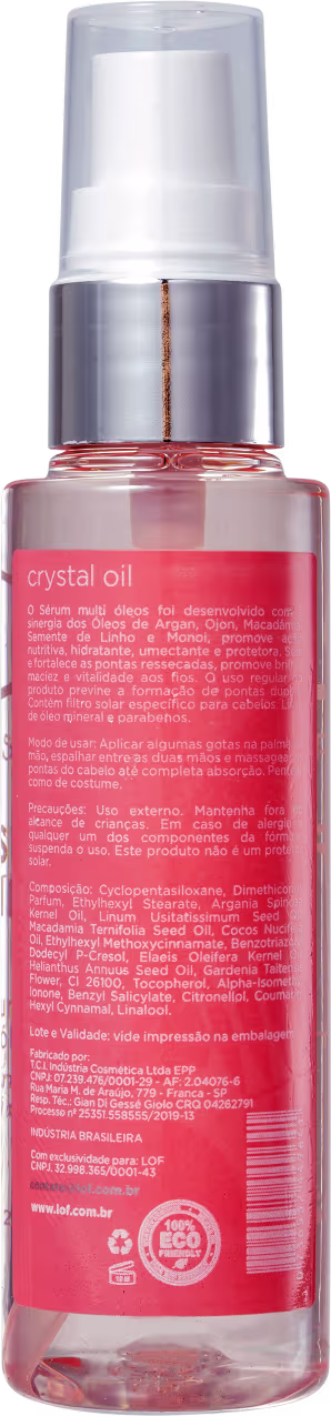 O Óleo Capilar LOF Professional Crystal Oil Sérum apresenta fórmula exclusiva e poderosa, com os óleos de Argan, Ojon, Macadâmia, Semente de Linho e Monoi entre as maiores estrelas da composição. O resultado é um produto que embeleza, trata e, com o uso regular, previne até mesmo a formação de pontas duplas.
