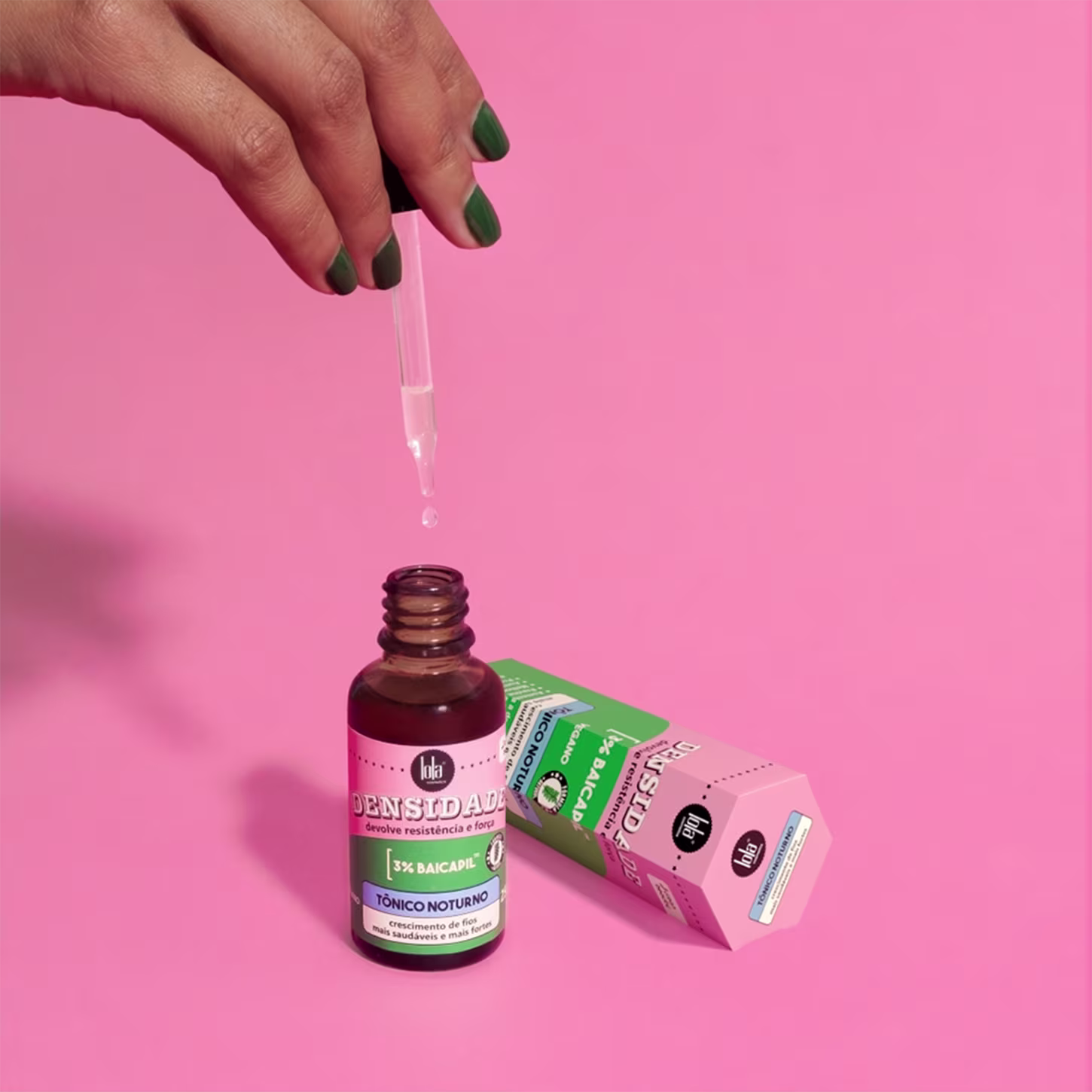Tônico Capilar Noturno Lola Cosmetics Densidade aumenta a atividade celular e protege o folículo do envelhecimento do estresse oxidativo, promove o crescimento saudável dos fios, com mais força e resistência.