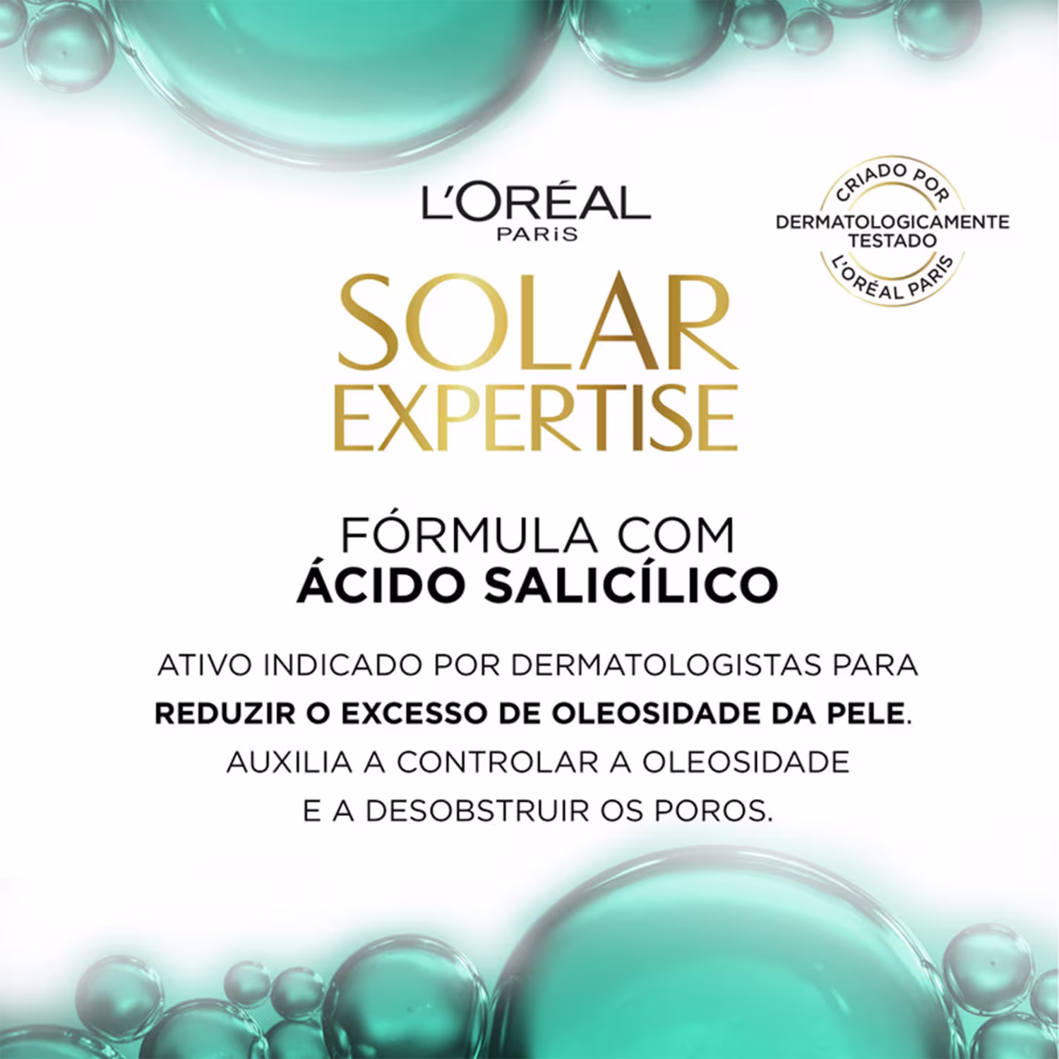 O Protetor Solar L'Oréal Paris Solar Expertise Antioleosidade conta com alta proteção UVA/UVB, previne o envelhecimento solar, rugas, marcas e queimaduras de sol. Ele também uniformiza o tom da pele e reduz o brilho com 12h de efeito matte.