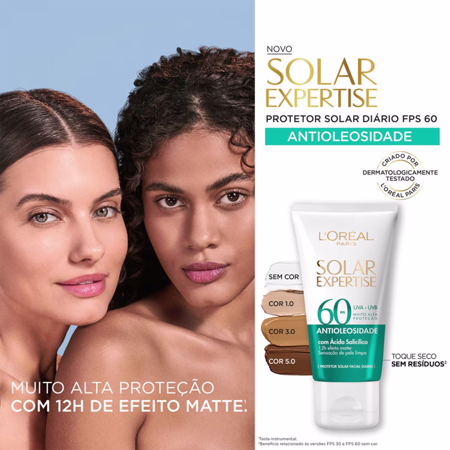 Protetor solar facial com cor para pele oleosa. L'Oréal Paris Solar Expertise Antioleosidade oil free, leve, fácil de espalhar e com rápida absorção.