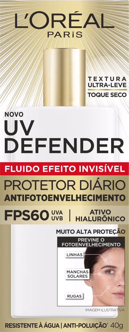 O Protetor Solar L'Oréal Paris UV Defender Fluido FPS 60 é o novo protetor solar facial diário, que conta com ação antienvelhecimento, preventiva de rugas, linhas de expressão e manchas solares. Sua textura é 11 vezes mais leve e associa o poderoso ativo dermatológico Ácido Hialurônico, à tecnologia NETLOCK e o FPS 60, para hidratar e preencher as linhas de expressão, sendo resistente ao suor, água e poluição e sem causar oleosidade. Seu uso constante reduz 7 anos de manchas solares em apenas 3 meses. Sua textura de nova geração altamente eficaz que forma um filme ultra fino, homogêneo, muito fácil de espalhar, que deixa a pele respirar e não deixa a pele esbranquiçada, com resistência ao suor, água e poluição.