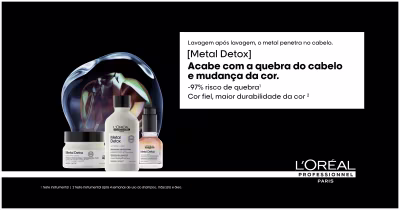 A linha inovadora L'Oréal Metal Detox neutraliza o metal dentro da fibra capilar e garante menos risco de quebra capilar, maior durabilidade da cor e mais brilho.