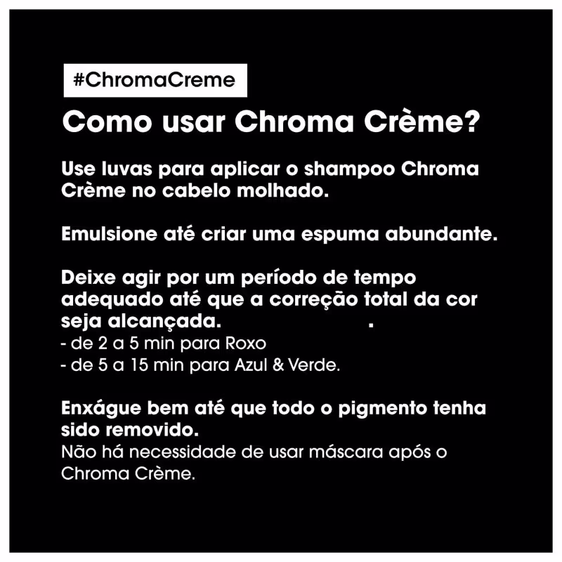 O Shampoo L'Oréal Professionnel Chroma Crème Roxo possui tecnologia exclusiva que combina o poder de correção da cor com o tratamento de uma máscara nutritiva. Sua fórmula possui pigmentos profissionais que serão responsáveis por uma neutralização homogênea e co-emulsão de moléculas de tratamento 10x menores que conseguem tratar as áreas mais danificadas e porosas dos cabelos.
