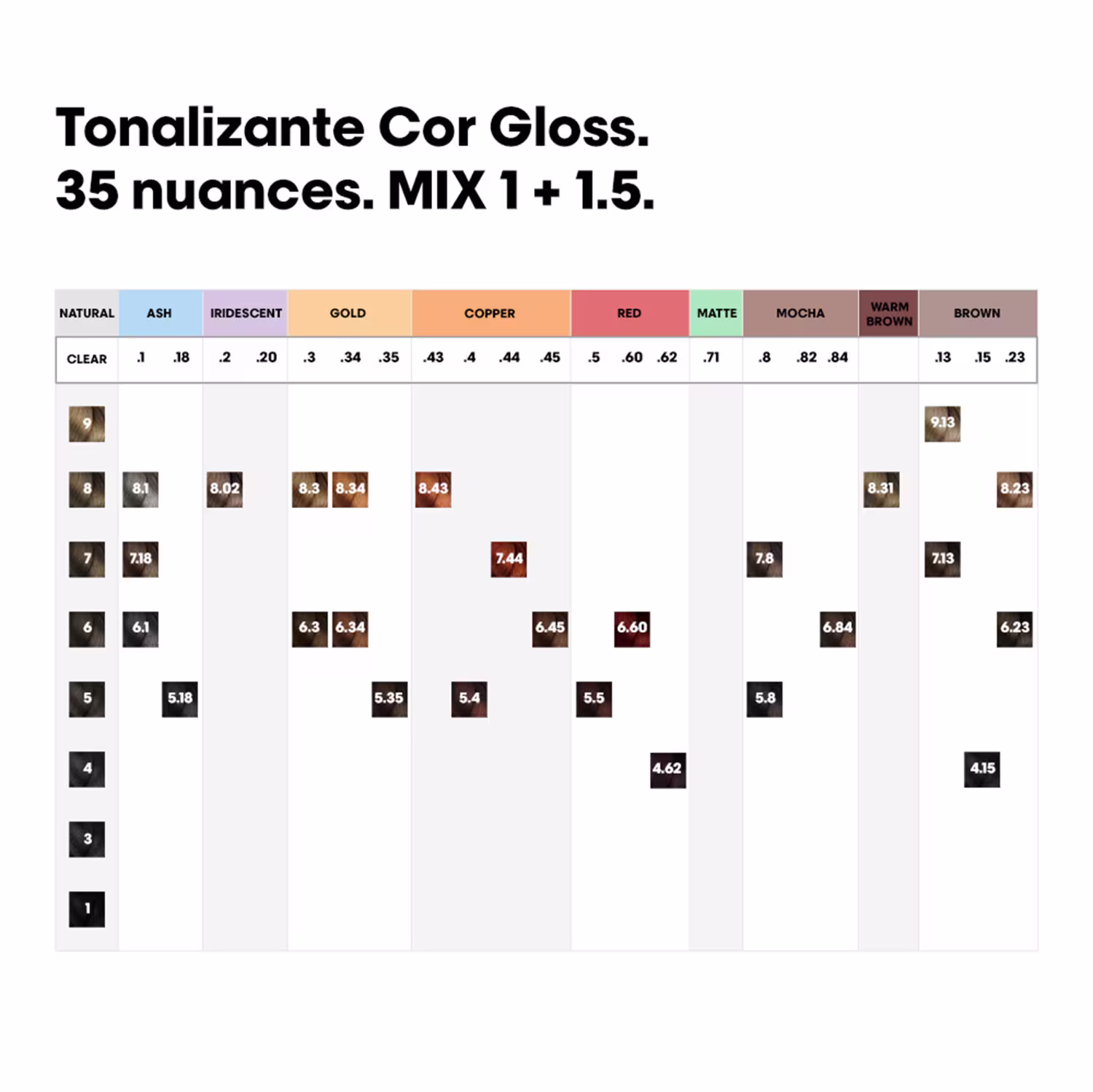 Permite personalizar os resultados com uma vasta paleta de tons, desde os loiros mais claros aos castanhos mais escuros, em tons frios, neutros e quentes;