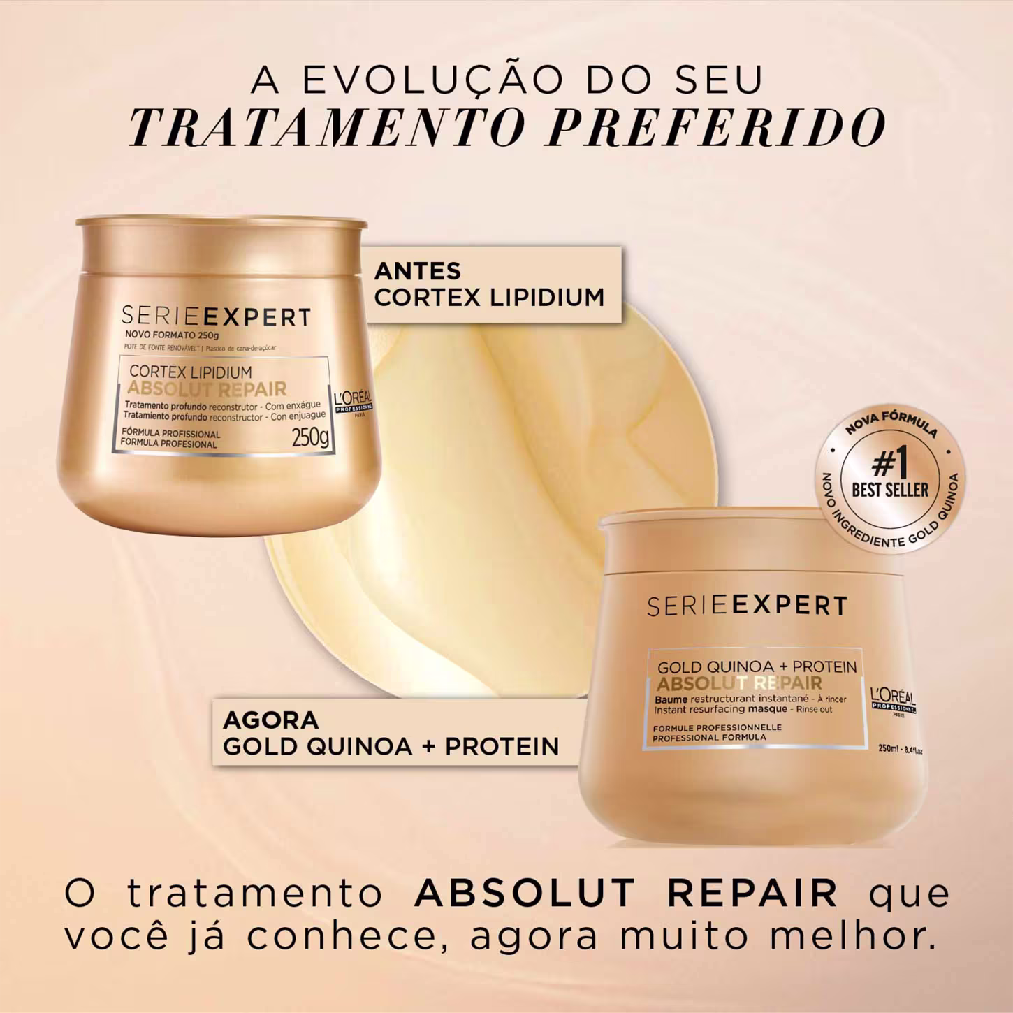 Os produtos da linha Absolut Repair foram repaginados com novos ativos para restaurar a saúde e o aspecto sedoso dos cabelos danificados e sensibilizados. Sua nova versão Absolut Repair Gold Quinoa + Protein traz mais benefícios e eficácia no tratamento dos fios.