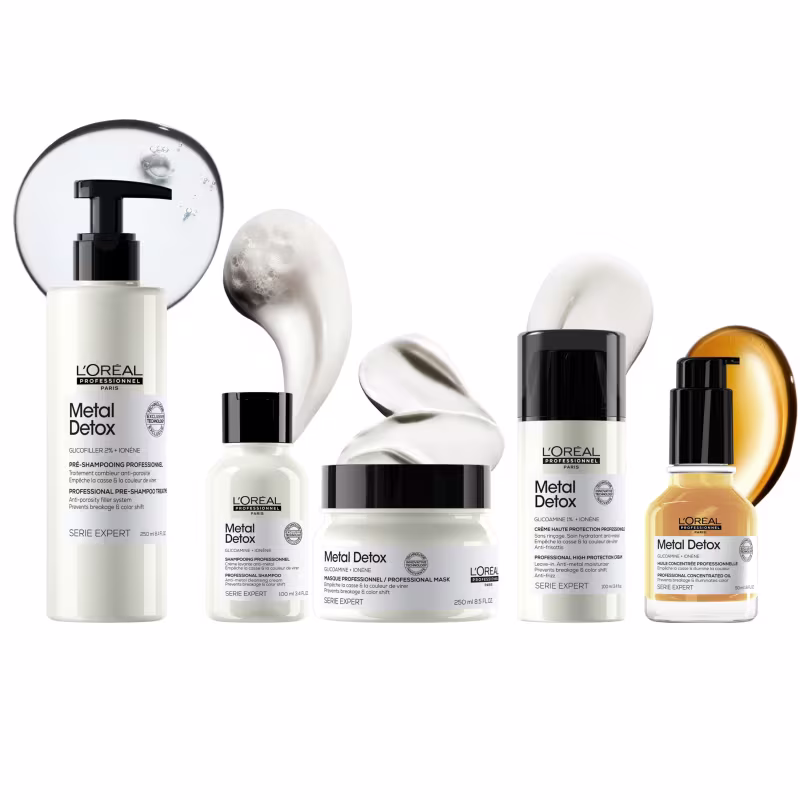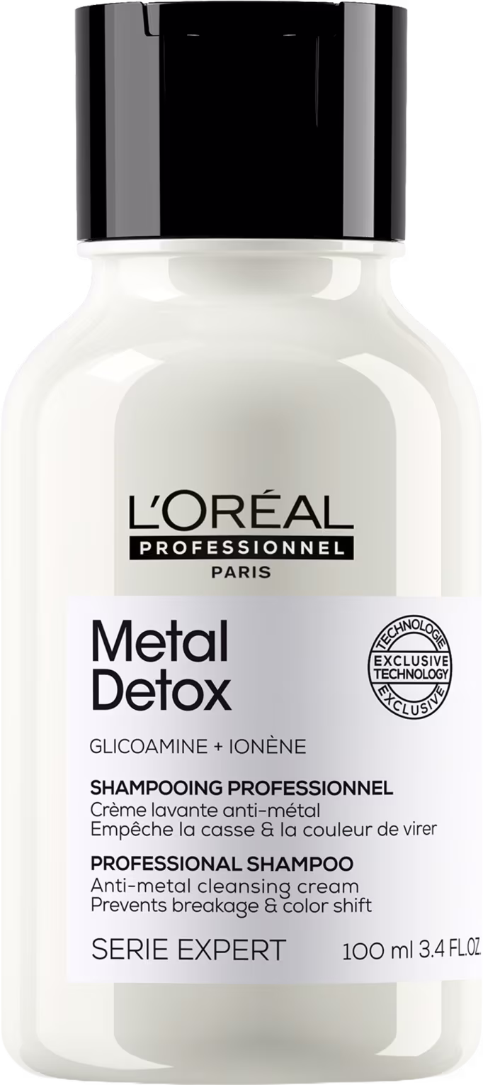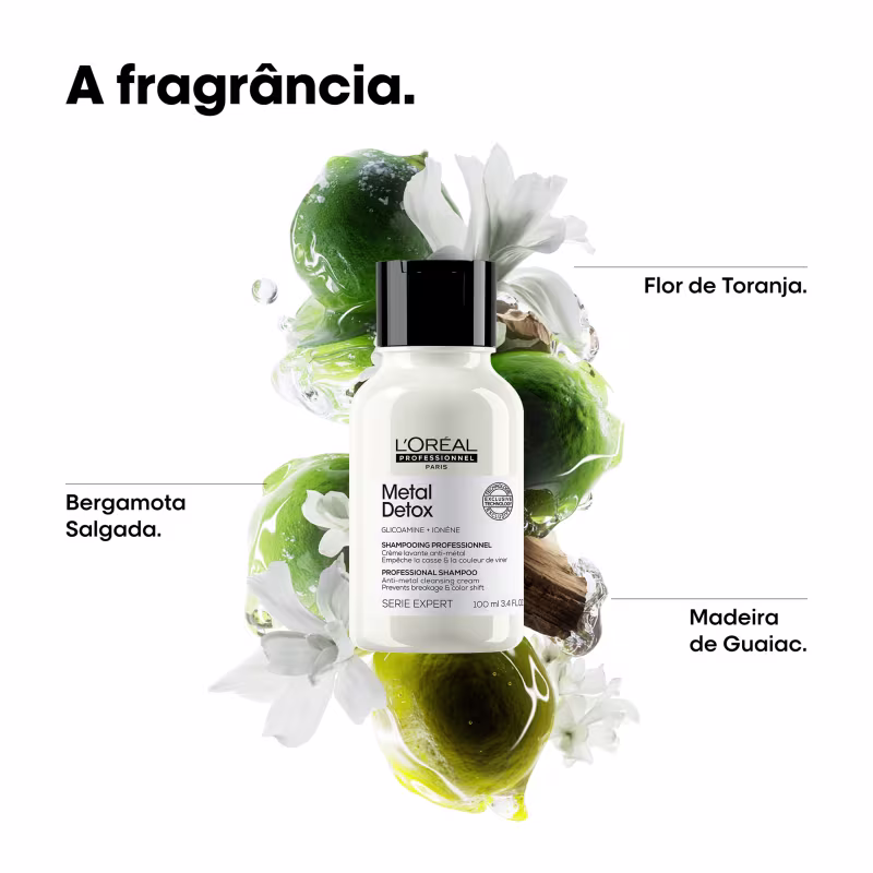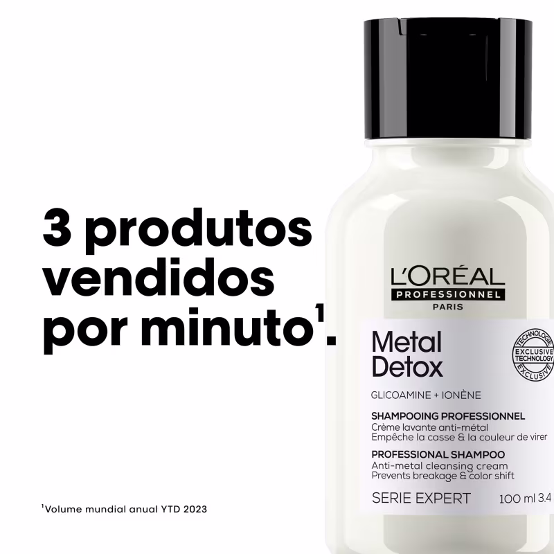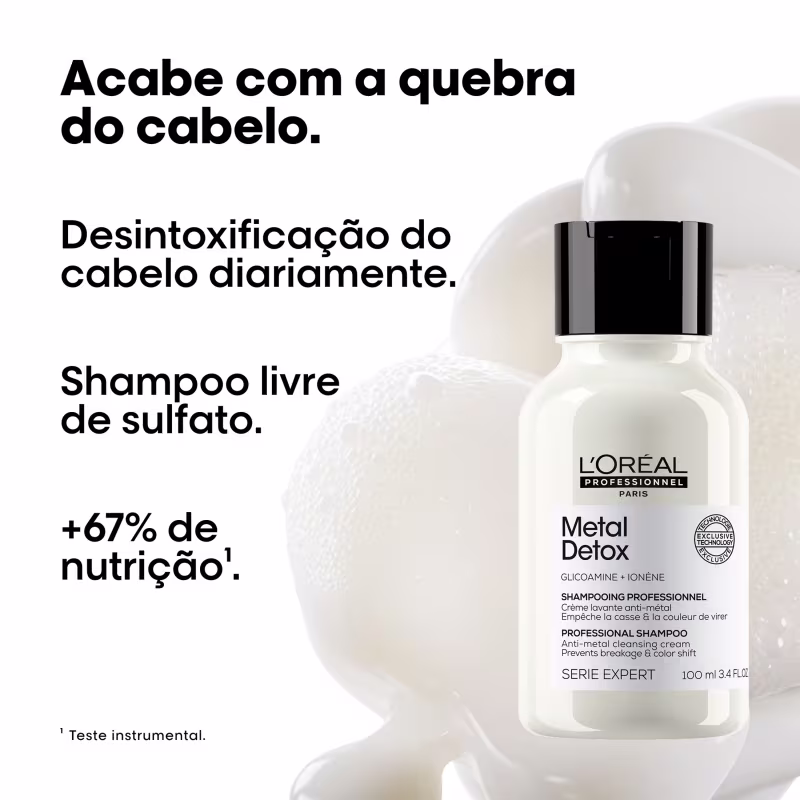 O Shampoo Metal Detox, de L'Oréal Professionnel, possui fórmula de limpeza anti-metal que além de remover as partículas de metal do cabelo, promove maciez, brilho, sedosidade, maior durabilidade da cor, com textura rica e cremosa, livre de sulfato.