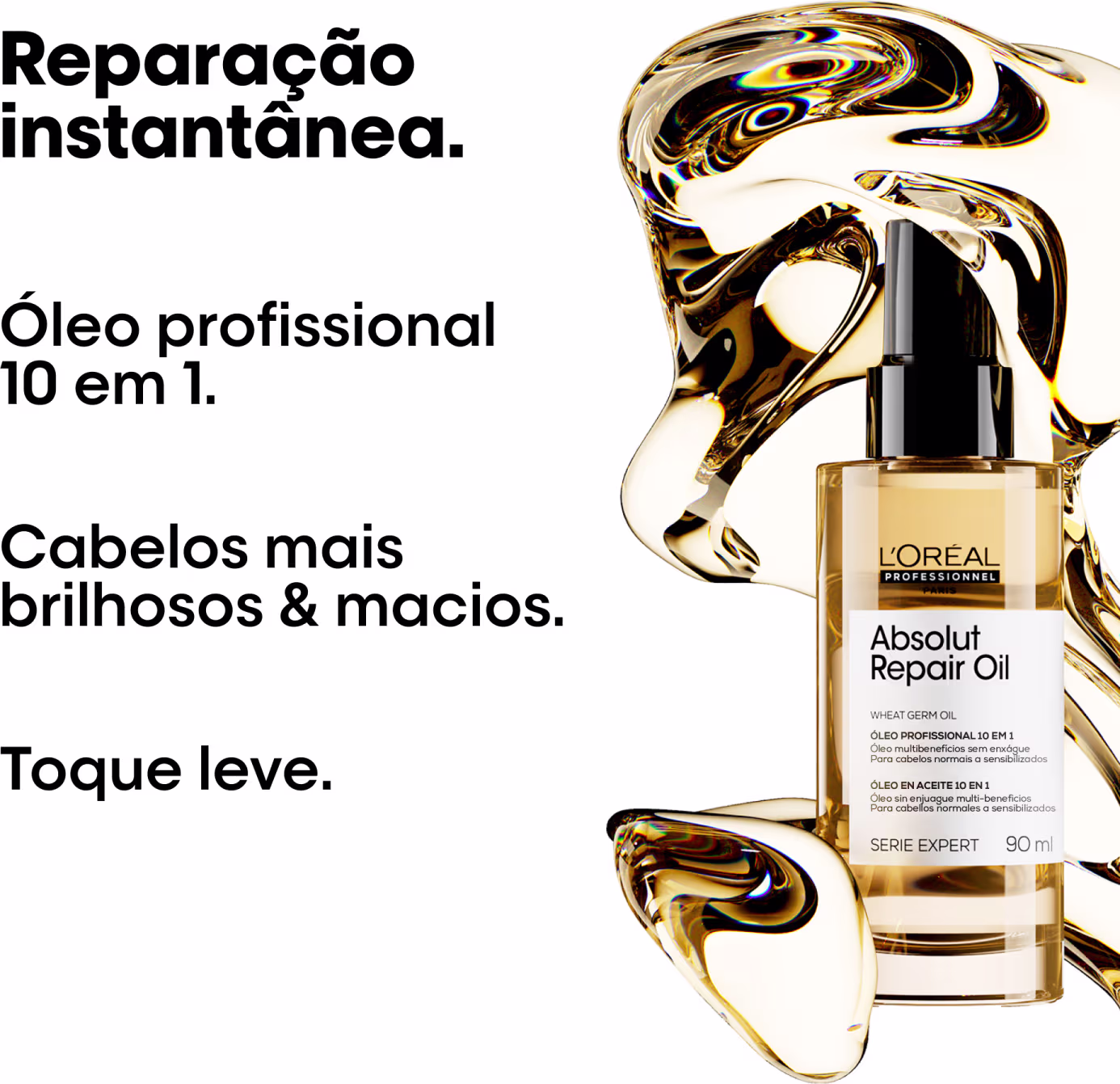 O Óleo Reparador L'Oréal Professionnel Serie Expert Absolut Repair 10in1 conta com tecnologia de co-emulsão, onde suas moléculas são 50% menores que as tradicionais e isso faz com que os ingredientes ativos penetrem profundamente na fibra, aperfeiçoando a superfície do cabelo.