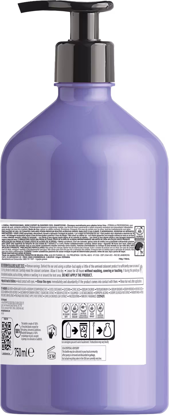Os pigmentos roxos presentes da fórmula do Shampoo Matizador L’Oréal Professionnel Serie Expert Blondifier Cool retiram tons amarelados ou alaranjados que surgem com o tempo e têm concentração controlada para que não sobrecarreguem os fios. Limpa suavemente e hidrata.
