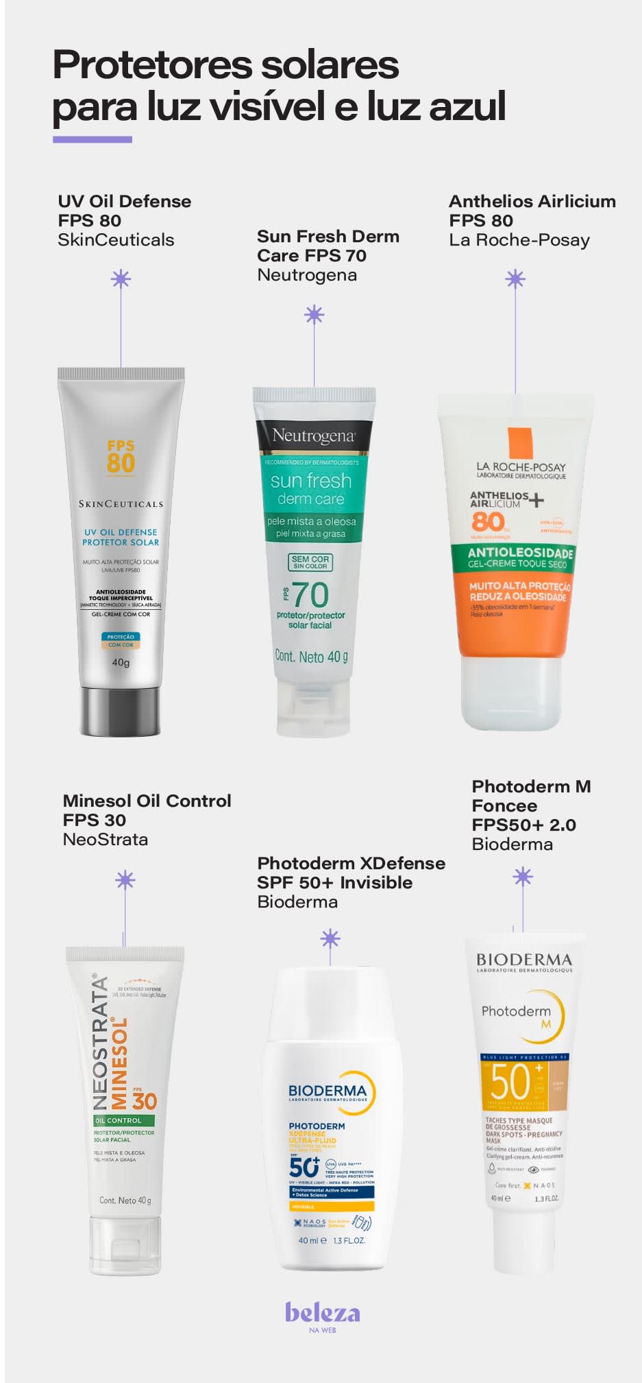 Não. A maioria dos protetores solares protegem apenas contra os raios UVA e UVB. O único tipo de produto que bloqueia os efeitos da luz visível na pele são os filtros físicos, que devem conter dióxido de titânio ou óxido de zinco na composição. Esses ingredientes refletem e dispersam a luz, construindo uma barreira física contra as radiações. Geralmente, esses são os protetores com cor.