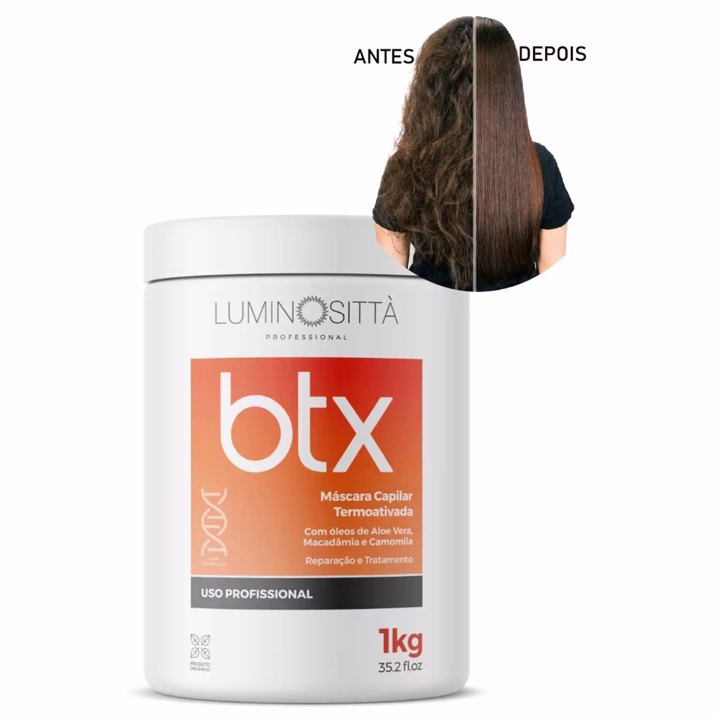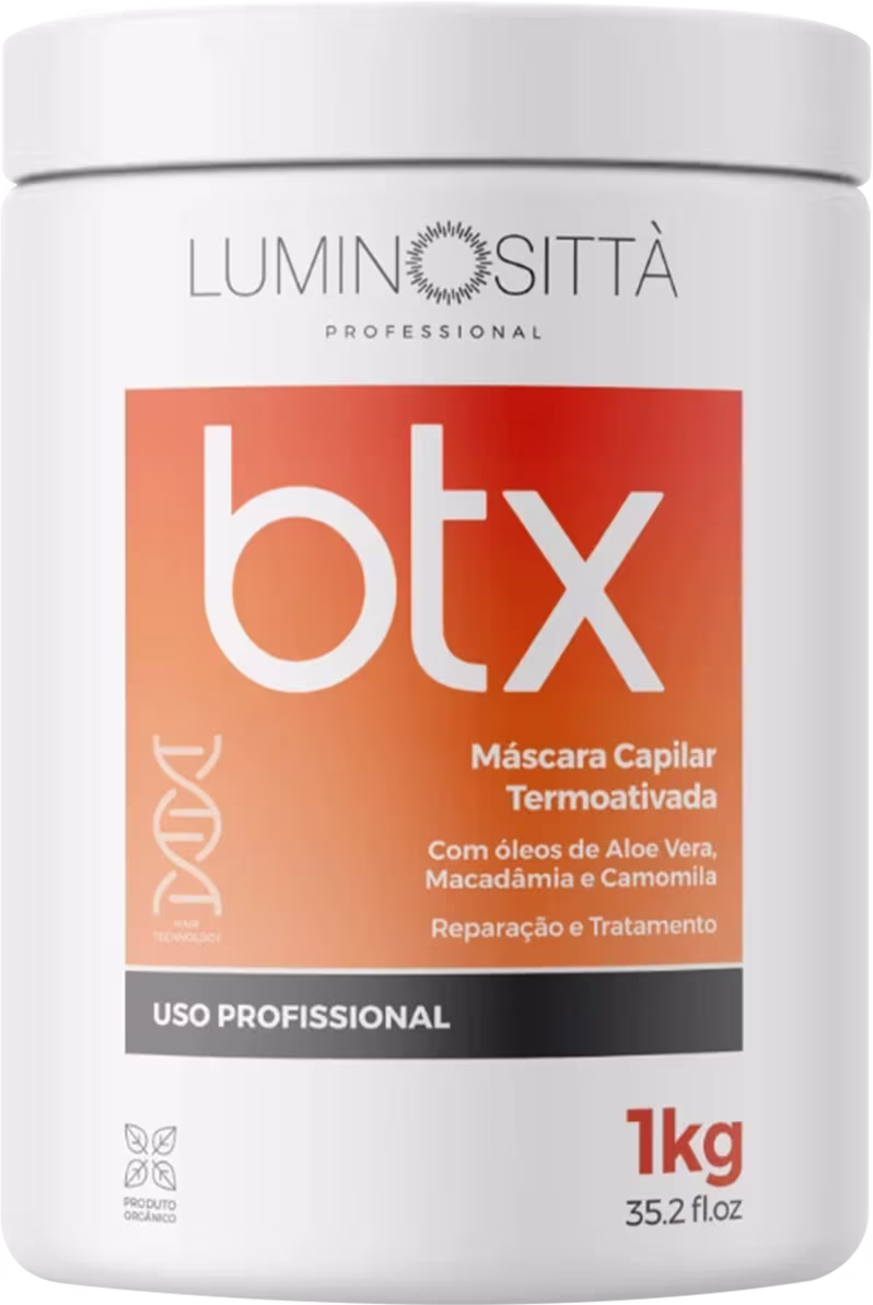 A Máscara Capilar Termoativada Luminosittà Professional BTX é um produto de alto desempenho que combina óleos de Aloé Vera, macadâmia e camomila para proporcionar múltiplos benefícios. O Aloé Vera combate a queda capilar, recupera pontas espigadas, aumenta a sedosidade, elimina o ressecamento e trata a quebra capilar. A macadâmia, um emoliente e hidratante natural, aumenta a suavidade do cabelo e das cutículas desidratadas. A camomila penetra profundamente na fibra capilar, recuperando-a de dentro para fora, selando as cutículas e intensificando o brilho e a maciez. Esta máscara ainda proporciona alinhamento dos fios, diminui o frizz, facilita a absorção de nutrientes e vitaminas, equilibra o pH do cabelo e possui ação anti-caspa, deixando os cabelos com um aspecto saudável e sem danos.