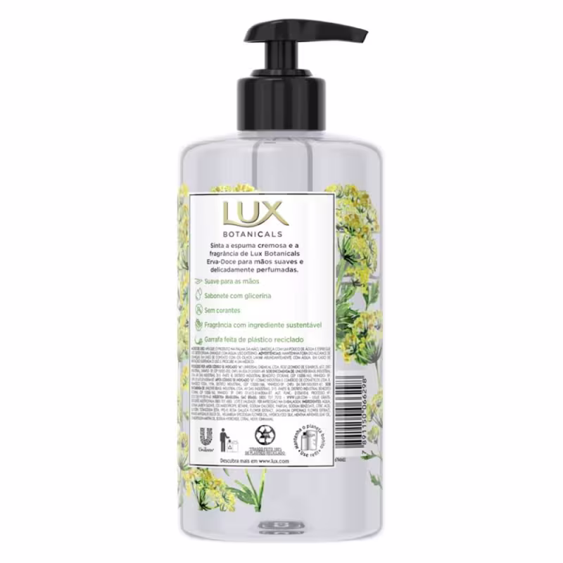 O Sabonete Líquido Lux Botanicals Erva-Doce foi buscar na natureza a sua exclusiva mistura de extratos de flores e óleos essenciais, transformando o seu momento em um verdadeiro ritual de beleza em onde o resultado é uma pele macia, bonita, radiante e delicadamente perfumada. Encante-se com sua espuma cremosa e a explosão aromática.