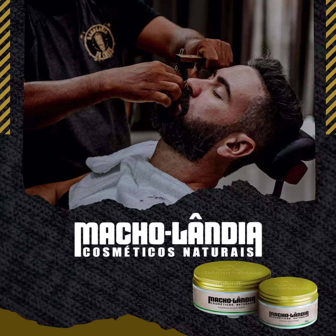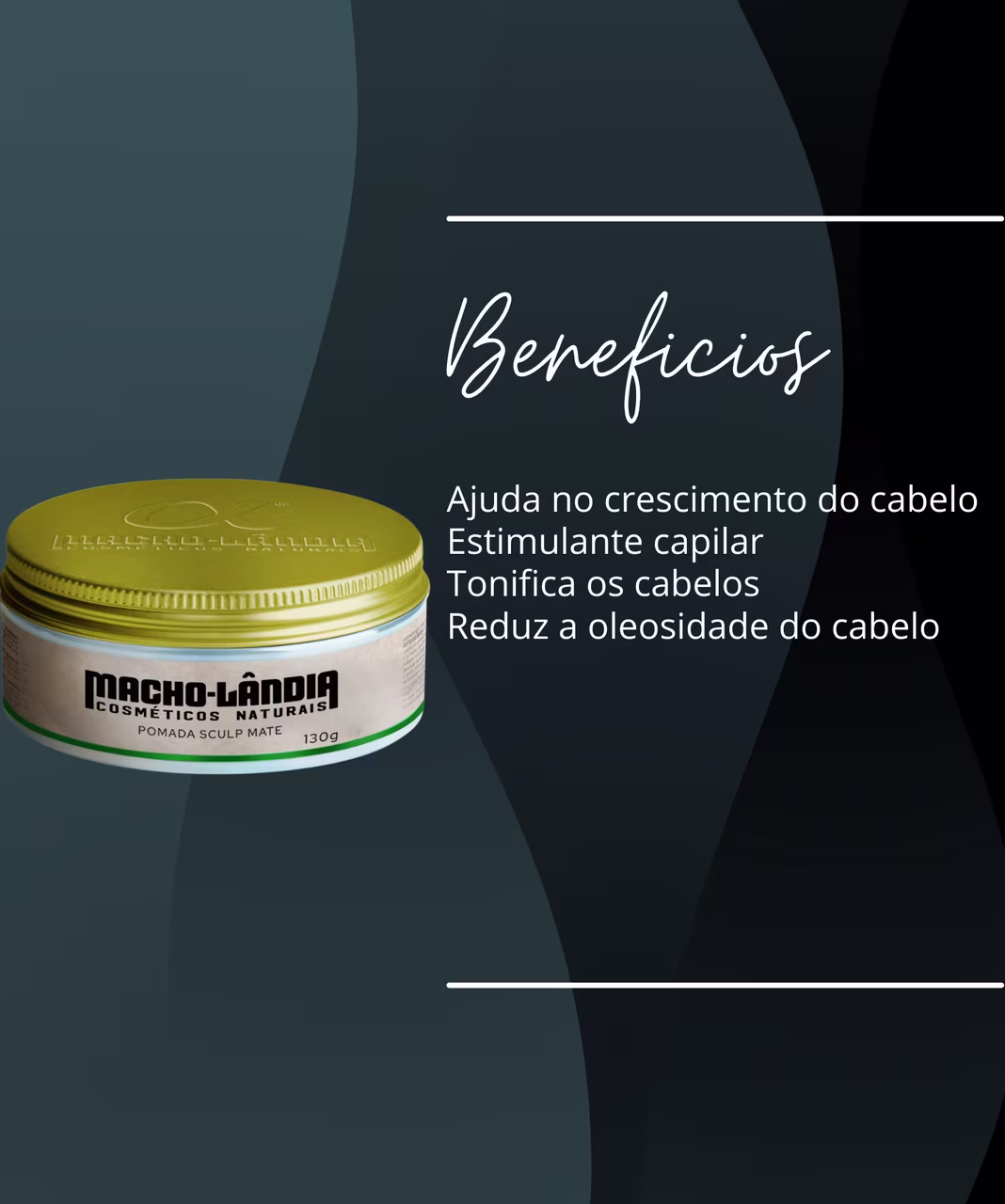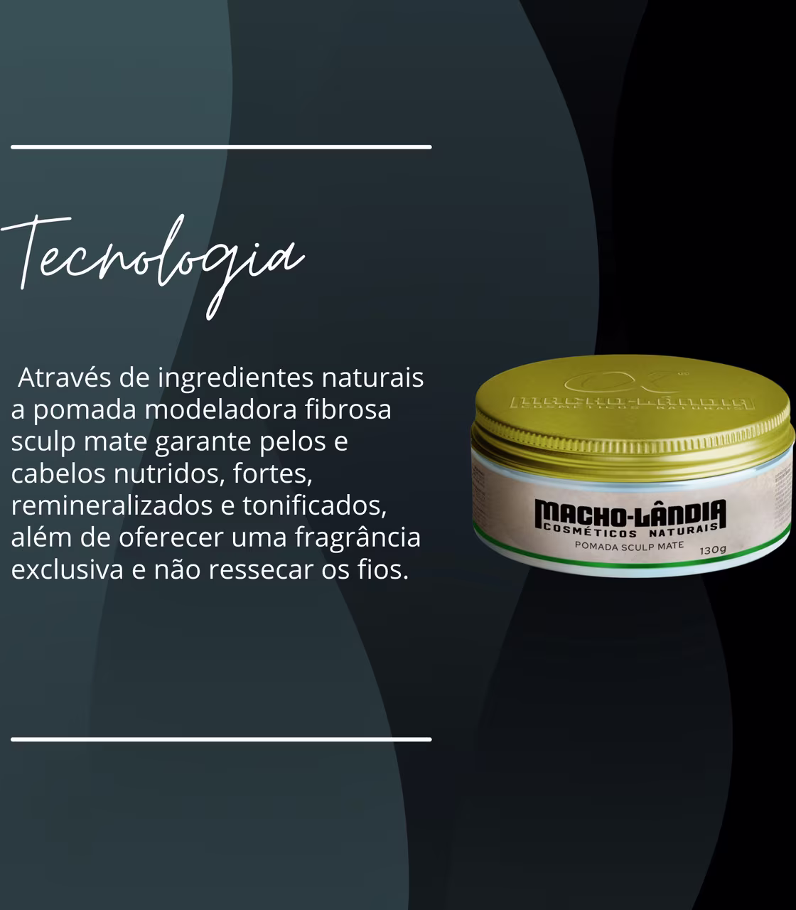 A Pomada Modeladora para Cabelo Macho-Lândia Sculp Mate com ingredientes naturais exclusivos como Turmalina, Folha de Limão, Cera de Abelha e Urtiga. Ideal para cabelos masculinos que necessitam de controle de volume e alinhamento, a pomada proporciona fixação alta e efeito seco, garantindo um resultado final sofisticado e duradouro. Os componentes da fórmula atuam de forma sinérgica para estimular o crescimento capilar, tonificar os fios e reduzir a oleosidade, criando um ambiente capilar equilibrado. A textura fibrosa permite modelagem precisa, sem deixar os cabelos rígidos ou com aparência artificial, mantendo um aspecto natural e elegante. Seu aroma masculino e sofisticado complementa a experiência sensorial do produto, tornando-o uma escolha premium para cuidados capilares masculinos.