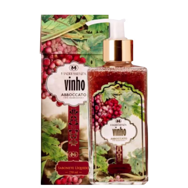 Sabonete líquido. Madressenza Vinho possui fragrância frutada com notas de uva e produz uma espuma cremosa e duradoura para uma sensação de conforto.