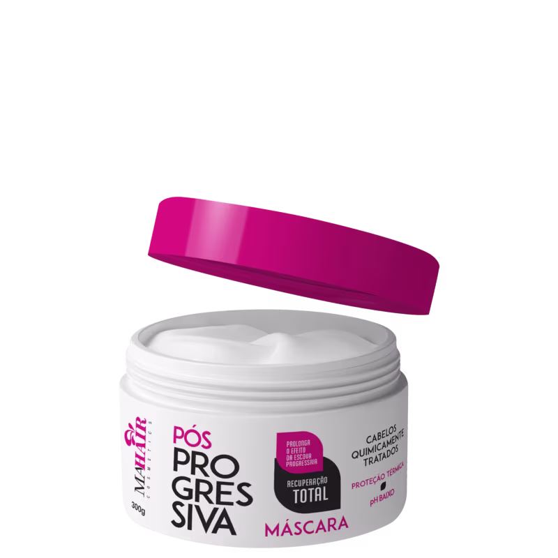 Máscara capilar para cabelos danificados. Mahair Pós Progressiva proporciona proteção térmica, fortalece os fios e controla o frizz.