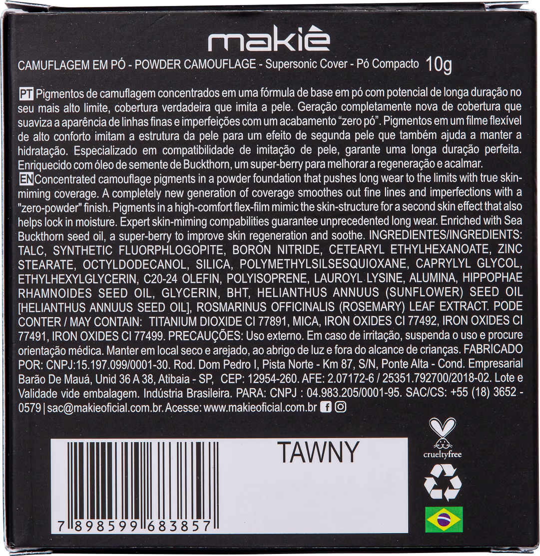 Pó Compacto facial de alta cobertura. Makiê Powder Camouflage Supersonic Cover disfarça imperfeições com eficiência e com duração prolongada. Inspirado na camuflagem, carro chefe da marca, garante uma pele perfeita e totalmente coberta.