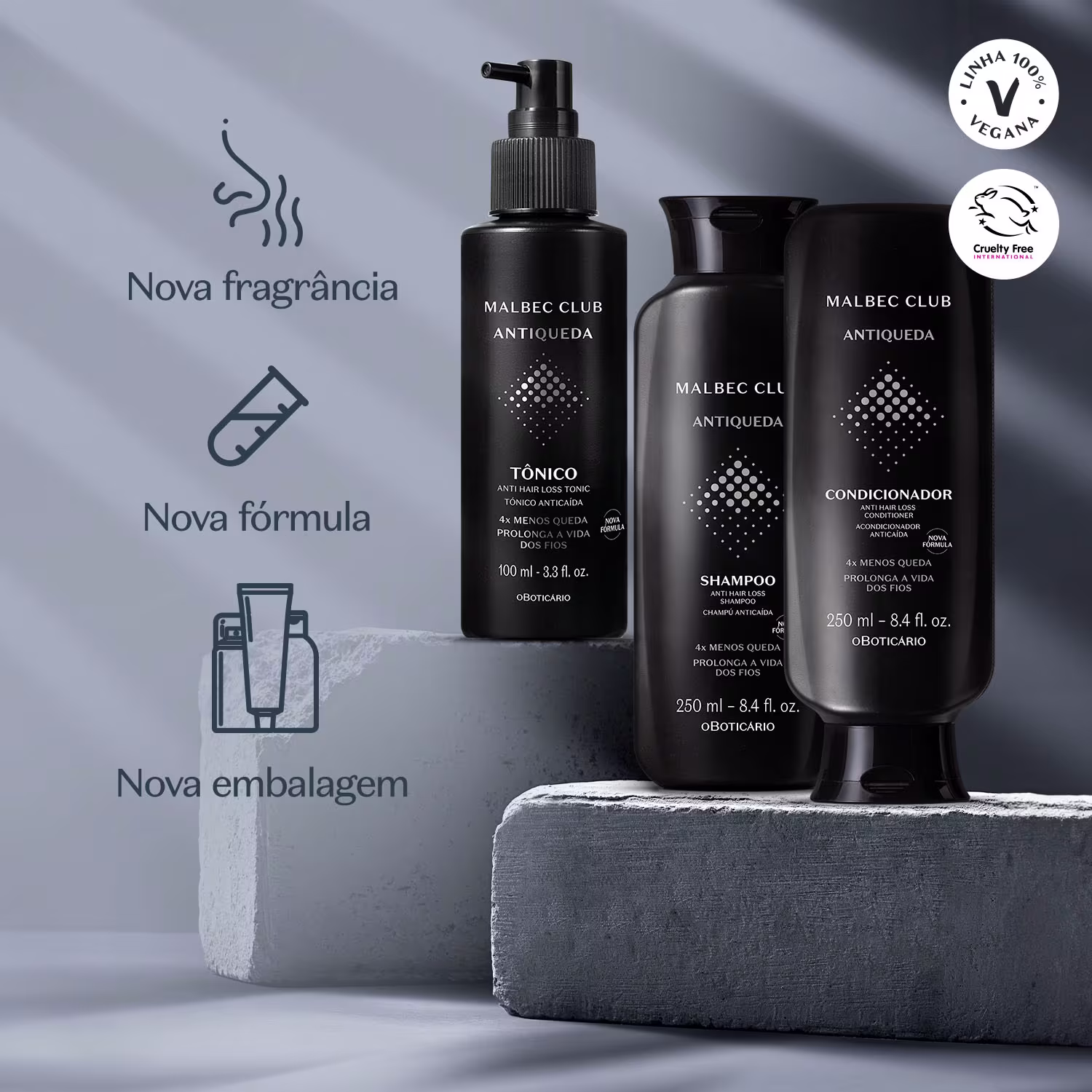Malbec Club Antiqueda é uma linha de tratamento completa do Boticário desenvolvida com tecnologia e ciência para tratar os problemas da calvície e afinamentos dos fios. Você encontra 3 itens com fórmulas que contém ingredientes potentes que estimulam o crescimento capilar, aumentam a densidade dos fios e reduzem a perda de cabelo, deixando-os com uma aparência muito mais saudável.