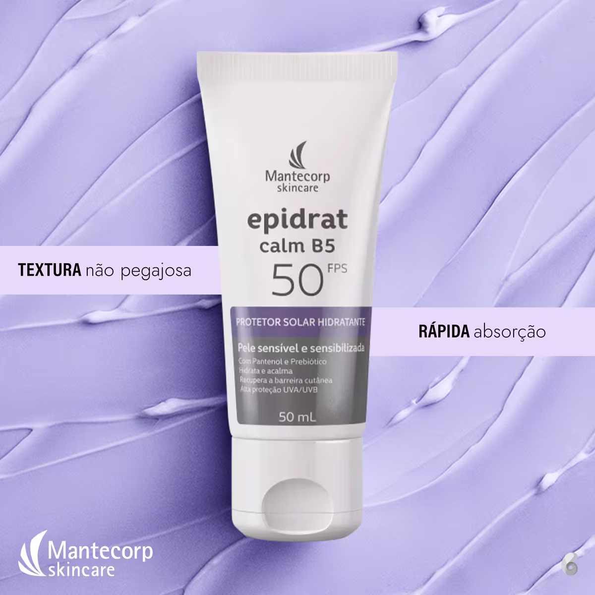 O Protetor Solar Facial Mantecorp Epidrat Calm 50FPS possui ativos que acalmam a cútis, mantém a integridade da barreira cutânea e proporciona conforto imediato. Além disso, possui uma textura não pegajosa, tem rápida absorção e promove uma recuperação rápida.
