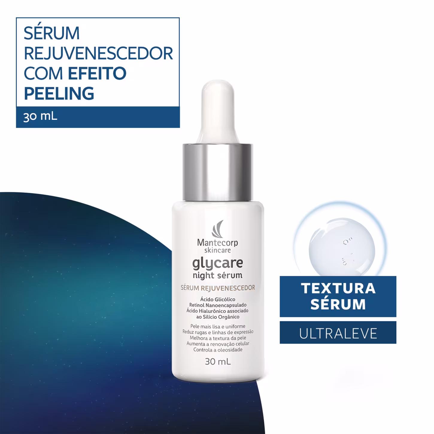Sérum Hidratante Facial Mantecorp Glycare Night ultraleve noturno, é indicado para todos os tipos de pele. Com alta concentração, possui uma tríade exclusiva de potentes ativos revigorantes: Ácido Glicólico, Retinol nanoencapsulado e Ácido Hialurônico, associado ao Silício Orgânico. Juntos, os ingredientes das fórmulas promovem suavização de linhas finas e rugas de expressão, aumento da renovação celular, estímulo da produção de colágeno e elastina, hidratação e melhora visível da textura da pele.