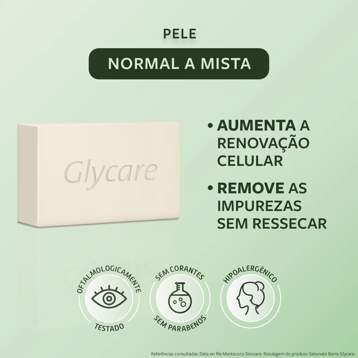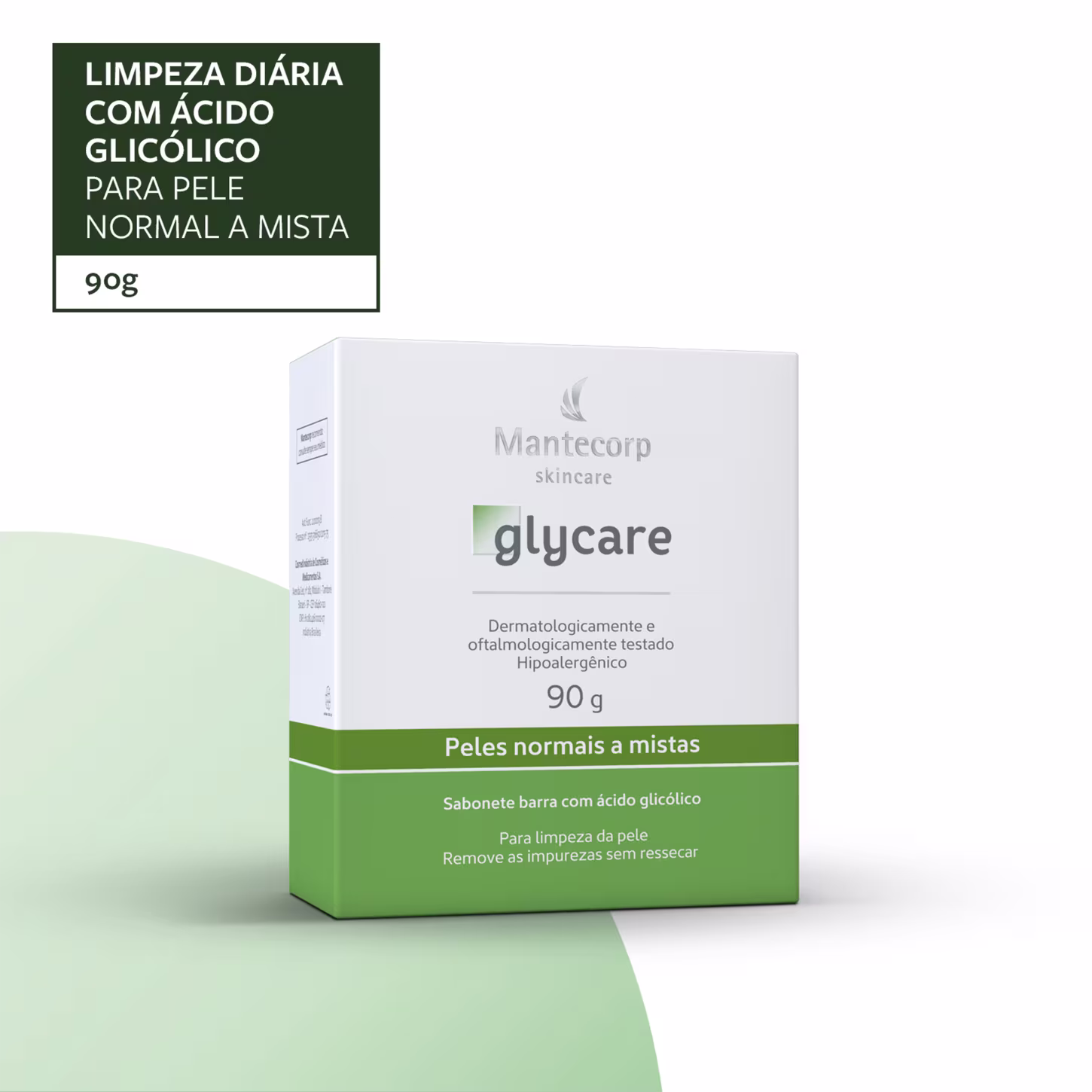 Sabonete em barra para peles normais a mista. Mantecorp Glycare higieniza sem ressecar, mantém a hidratação e a maciez.
