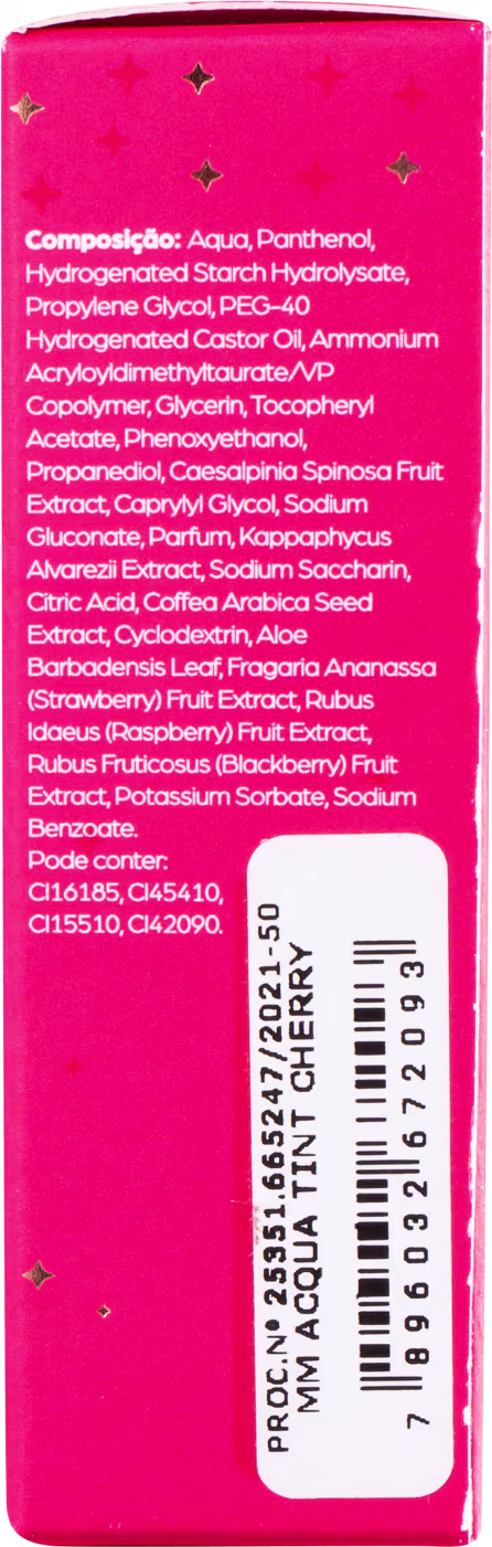 Lip Tint Mari Maria Makeup Acqua Tint traz fórmula rica em ativos naturais, com extrato de frutas vermelhas, potente agente antioxidante e hidratante, além do pantenol e extrato de aloe vera, que promovem uma boca hidratada e saudável. Contém ainda ativo antipoluição, reforçando a ação de barreira da pele contra a poluição. Versátil, pode ser usado para colorir os lábios ou dar um lindo toque corado às maçãs do rosto.