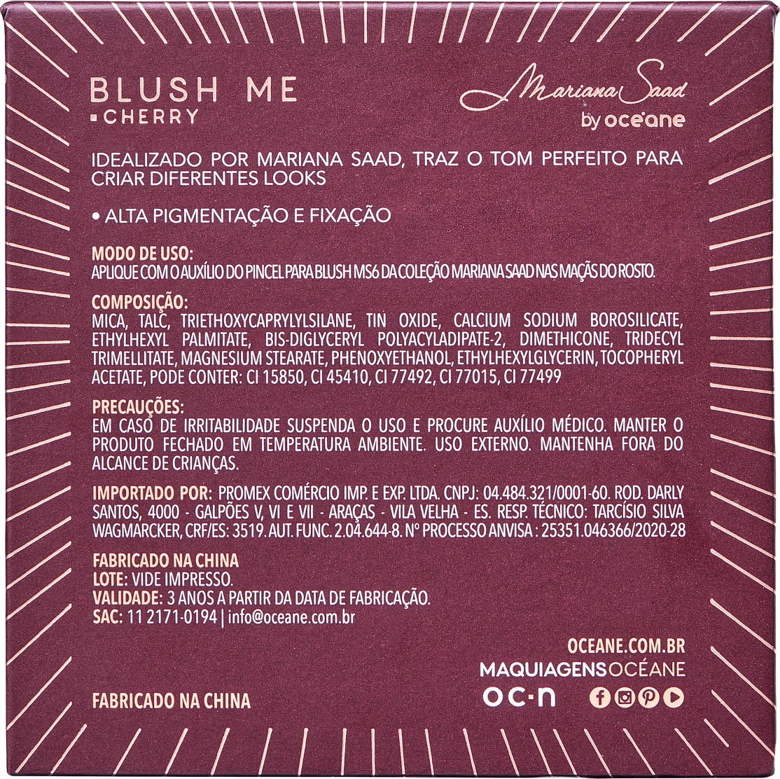 Blush compacto para todos os tipos de pele. Com alta pigmentação e acabamento cintilante, Mariana Saad by Océane Blush Me destaca as maçãs do rosto.