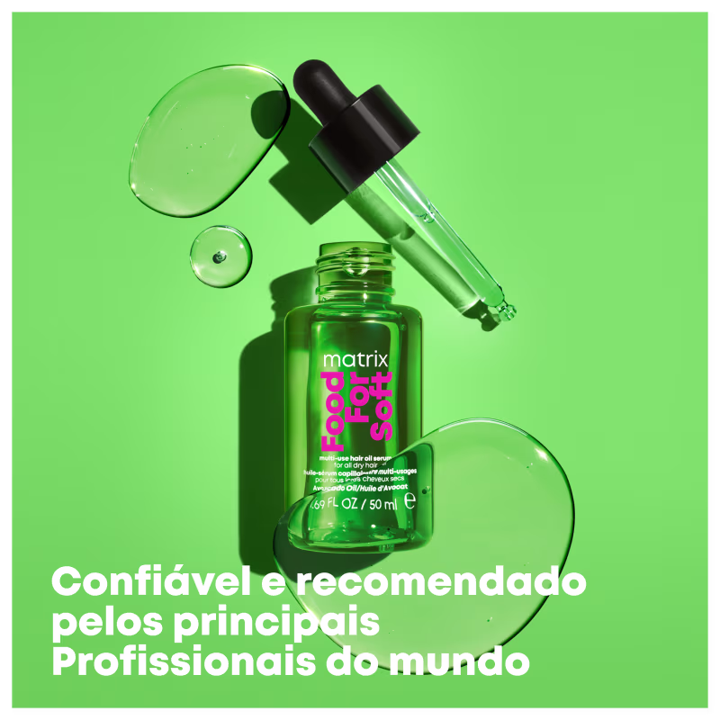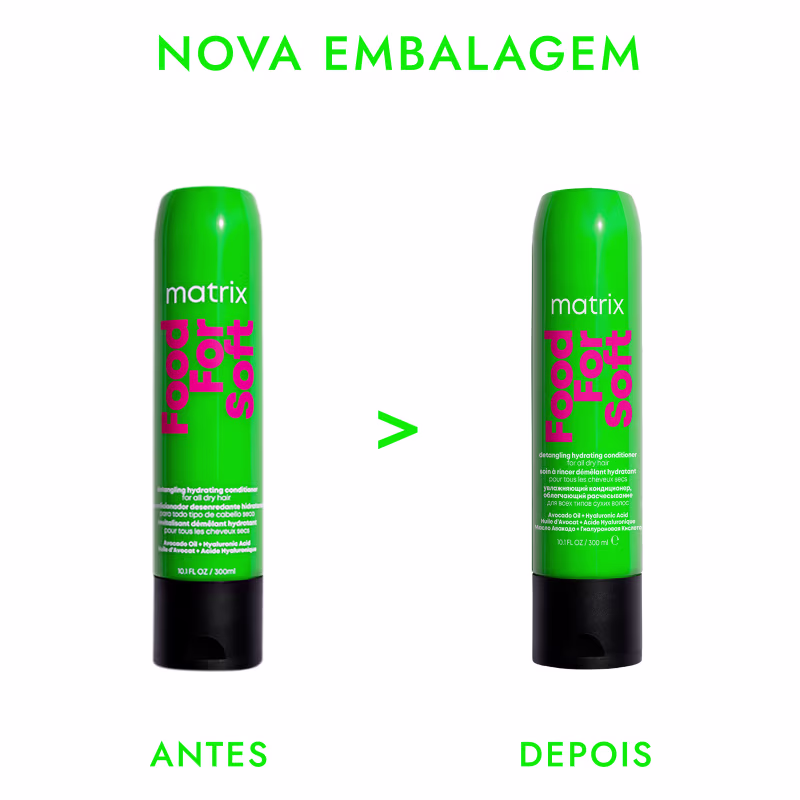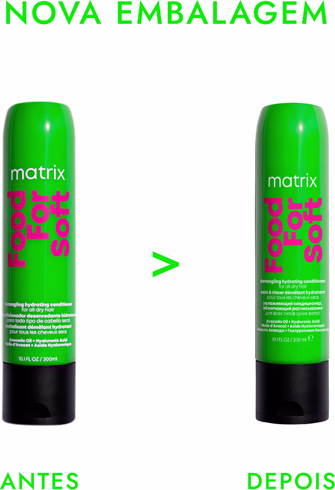 O Condicionador Hidratante Matrix Food For Soft conta com infusão de Óleo de Abacate e Ácido Hialurônico, que repõe a hidratação em cabelos secos e quebradiços, deixando o cabelo hidratado e macio, com acabamento suave e brilho extra, sem frizz e menos porosos.