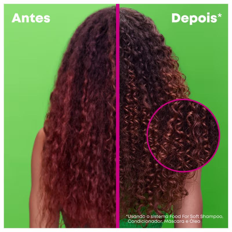 A linha Food For Soft proporciona 7x mais hidratação por até 72 horas quando usado como um sistema de shampoo, condicionador ou máscara e óleo Food For Soft em vez de shampoo sem condicionador.