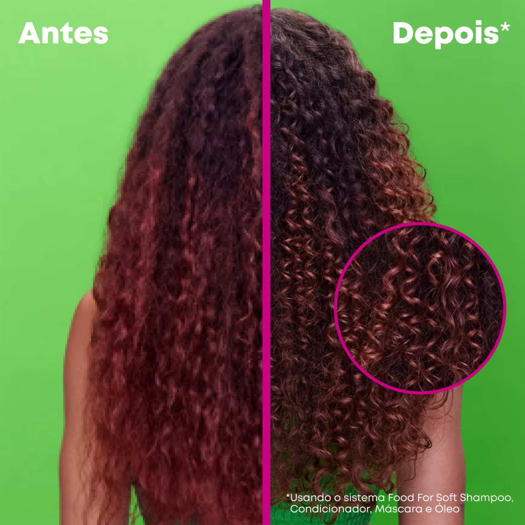 A linha Food For Soft promove 7x mais hidratação, com toque suave, por até 72 horas quando usado como um sistema de shampoo, condicionador ou máscara e óleo Food For Soft em vez de shampoo sem condicionador.