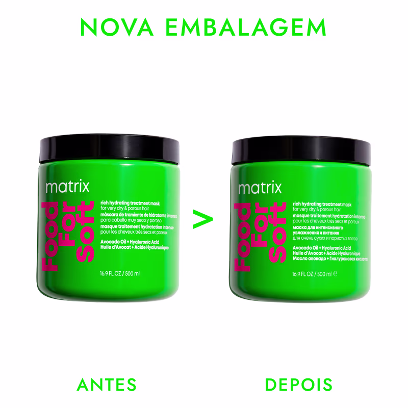A Máscara Capilar Hidratante Matrix Food For Soft conta com a a ação do Óleo de Abacate e Ácido Hialurônico para hidratar e reter a hidratação da raiz às pontas para todos os tipos de cabelos secos e quebradiços. O cabelo fica hidratado e macio, com acabamento suave e brilho extra, sem frizz e menos poroso.
