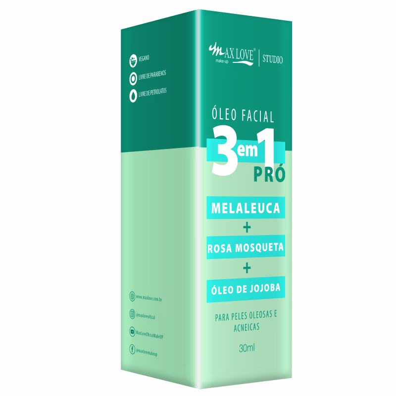 Mesmo que sua pele seja oleosa ou acneica, o Óleo Facial Max Love 3 em 1 Pró vai fazer uma verdadeira transformação na sua vida, já que ele é indicado especialmente para você. Ele traz um blend incrível de óleos de Melaleuca, Rosa Mosqueta e Jojoba para tirar a oleosidade que o seu rosto não precisa e dar toda a hidratação necessária.