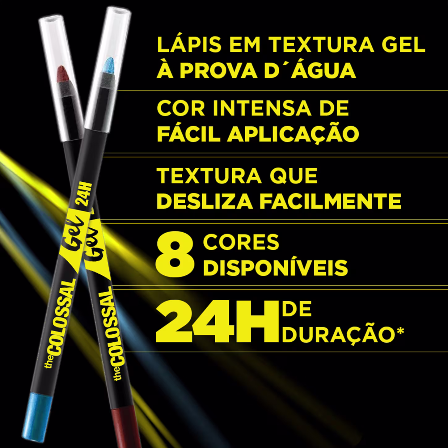 Lápis de olho à prova d'água. Maybelline Colossal Gel Lápis de Olho traz cores extremamente intensas e que duram até 24 horas sem escorrer ou desbotar.