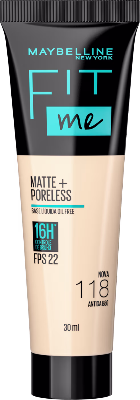 Base líquida com acabamento matte. Maybelline Fit Me Matte FPS 22 proporciona poros invisíveis, controle de oleosidade por até 16 horas e proteção UVA.