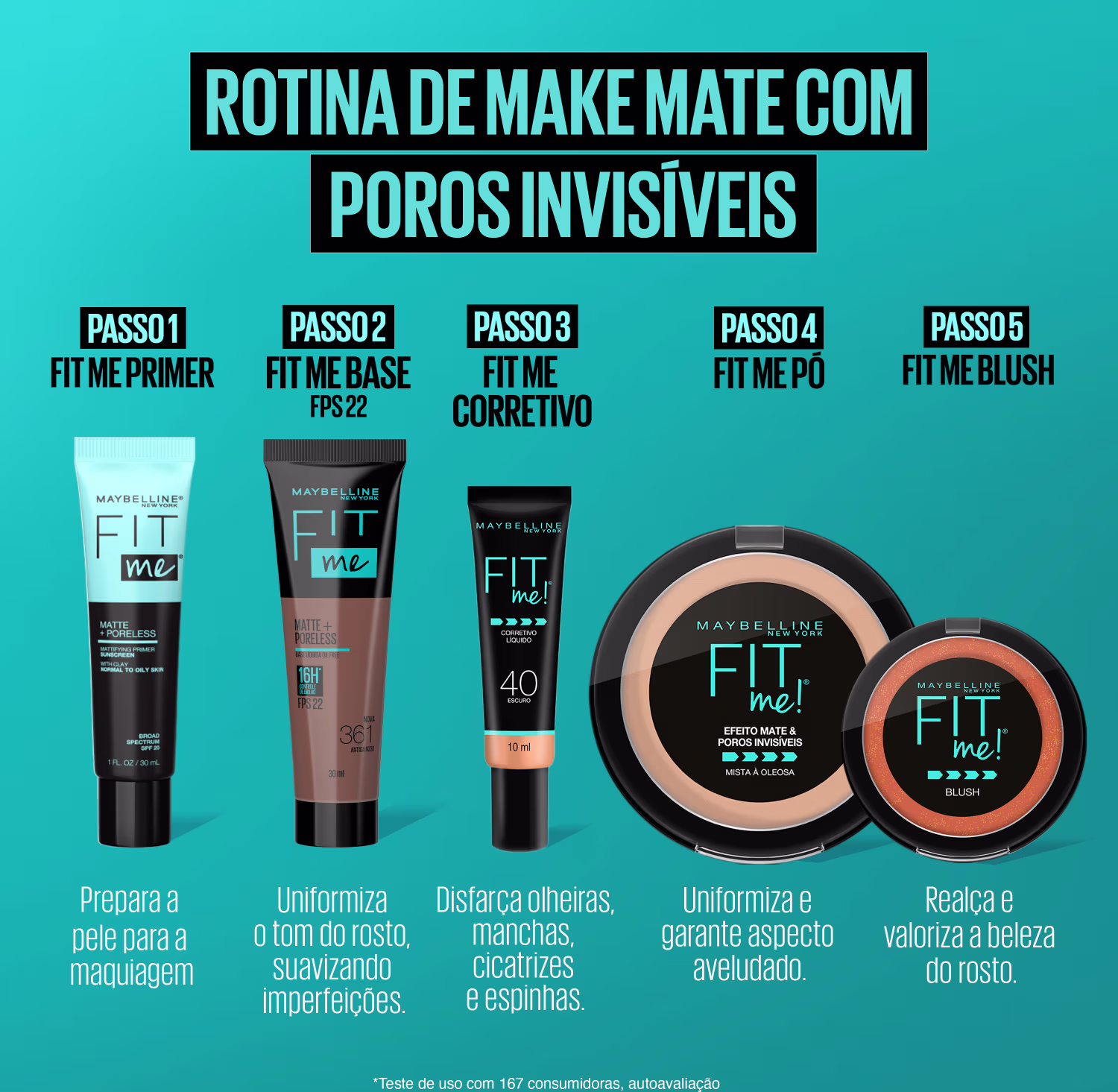 Base líquida com acabamento matte. Maybelline Fit Me Matte FPS 22 proporciona poros invisíveis, controle de oleosidade por até 16 horas e proteção UVA.