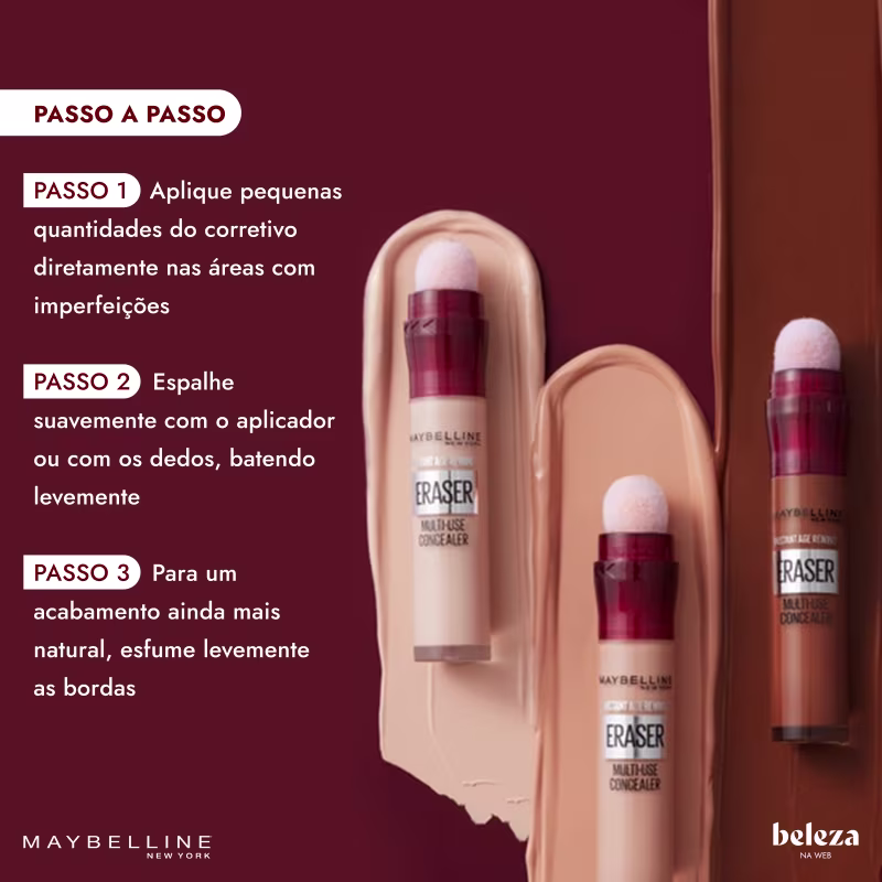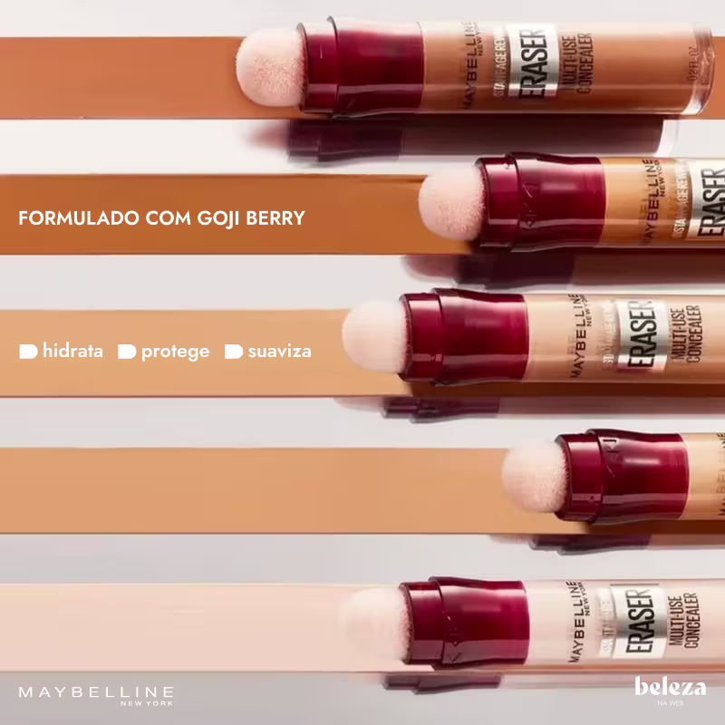 Corretivo líquido. Maybelline Instant Age Rewind Eraser é o segredo para uma pele impecável. Com alta cobertura e toque seco, ele corrige, contorna e ilumina, enquanto sua fórmula com Goji Berry trata a pele. O aplicador icônico garante praticidade para um acabamento natural e duradouro.