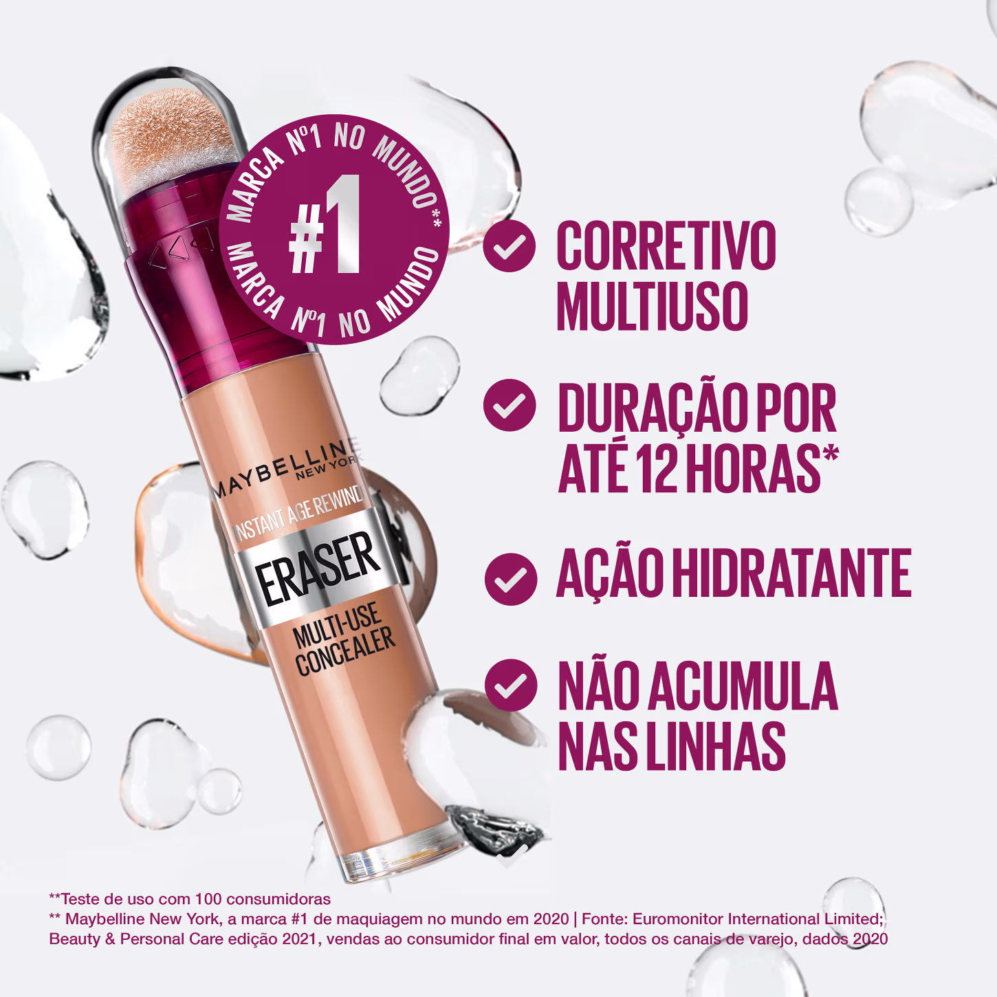 Corretivo líquido. Maybelline Instant Age Rewind Eraser é o segredo para uma pele impecável. Com alta cobertura e toque seco, ele corrige, contorna e ilumina, enquanto sua fórmula com Goji Berry trata a pele. O aplicador icônico garante praticidade para um acabamento natural e duradouro.
